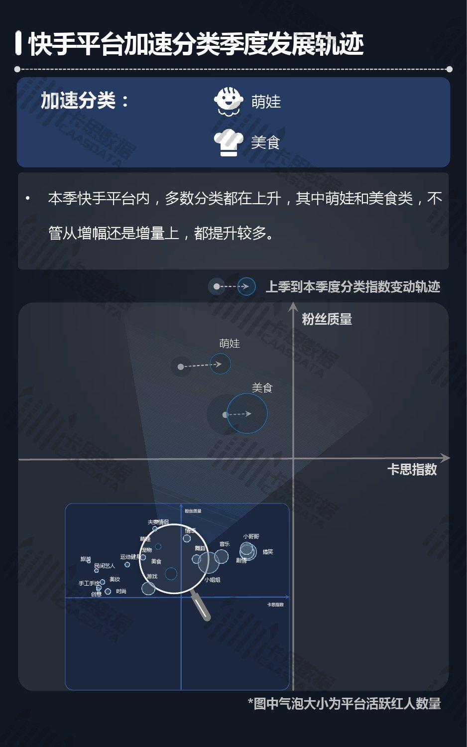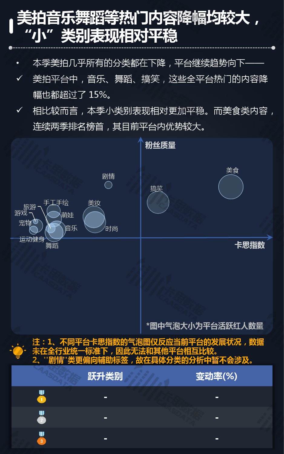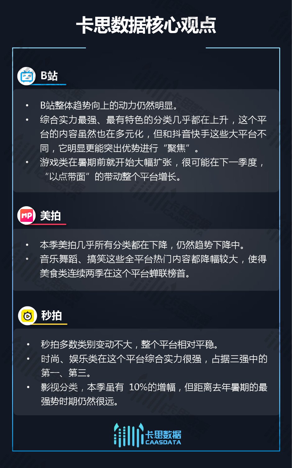 五大平台中,抖音本季度几乎全线上涨,且不少类别均是大幅增长,整个平台仍然明显趋势向上,其中搞笑、小哥哥、音乐、小姐姐类别在全行业非常强势,全部逆势上升; 快手平台内多数分类都在上升,其中萌娃和美食类,不管从增幅还是增量上,都提升较多; B站内小众但特色的分类越来越强,和大平台的大规模多元相比,更加聚焦; 美拍平台中,小类别表现相对更加平稳,而美食类内容连续两季排名榜首,目前在平台内优势较大; 秒拍多数分类小涨小跌,整个平台相对平稳。