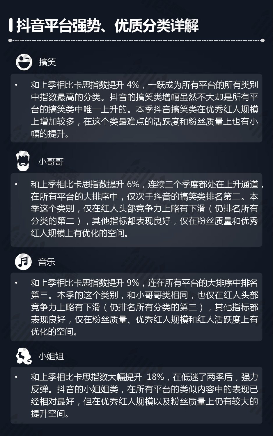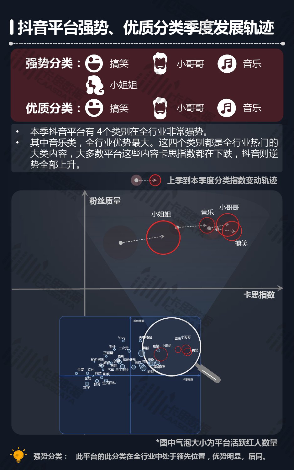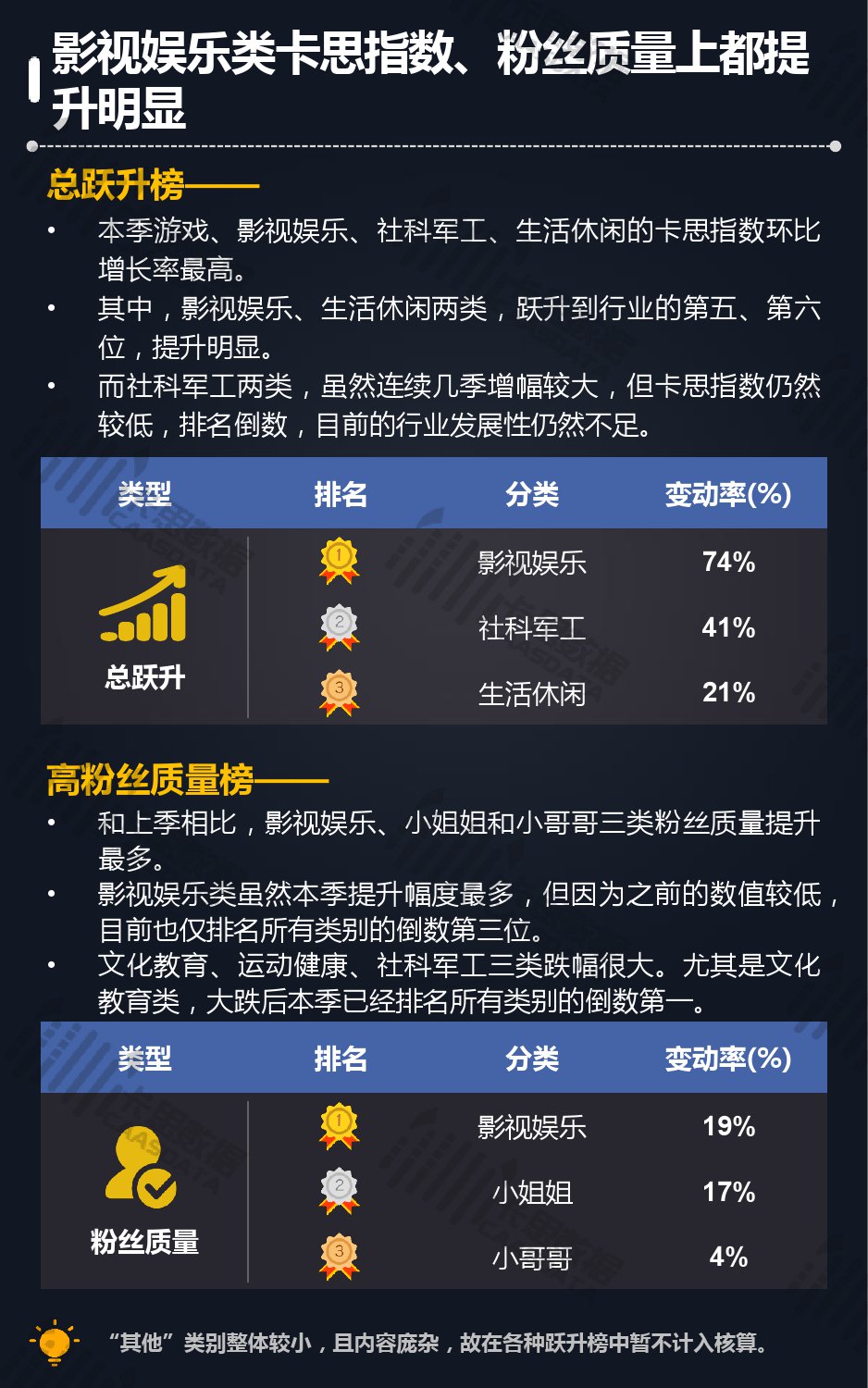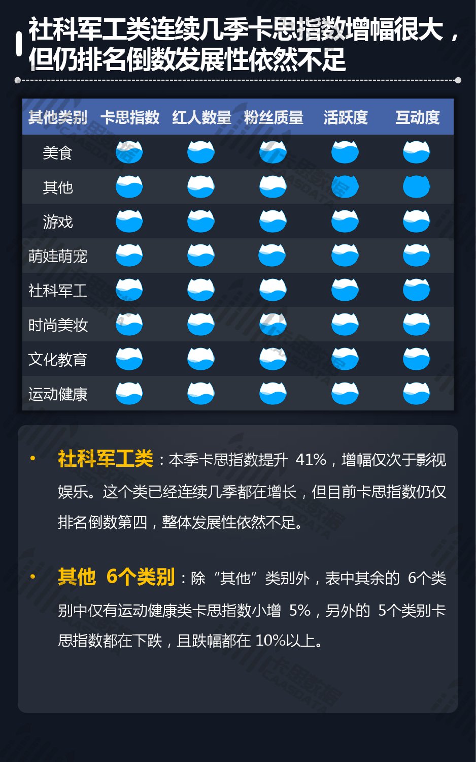 14个细分分类中,搞笑类、小哥哥、音乐舞蹈、小姐姐四类仍然在行业内领先,但优势在逐步缩小,搞笑类持续排名榜首,但和上季相比,卡思指数下降了13%; 影视娱乐和生活休闲两类本季卡思指数大涨,综合实力提升明显; 社科军工类连续几季卡思指数增幅很大,但整体发展性依然不足。