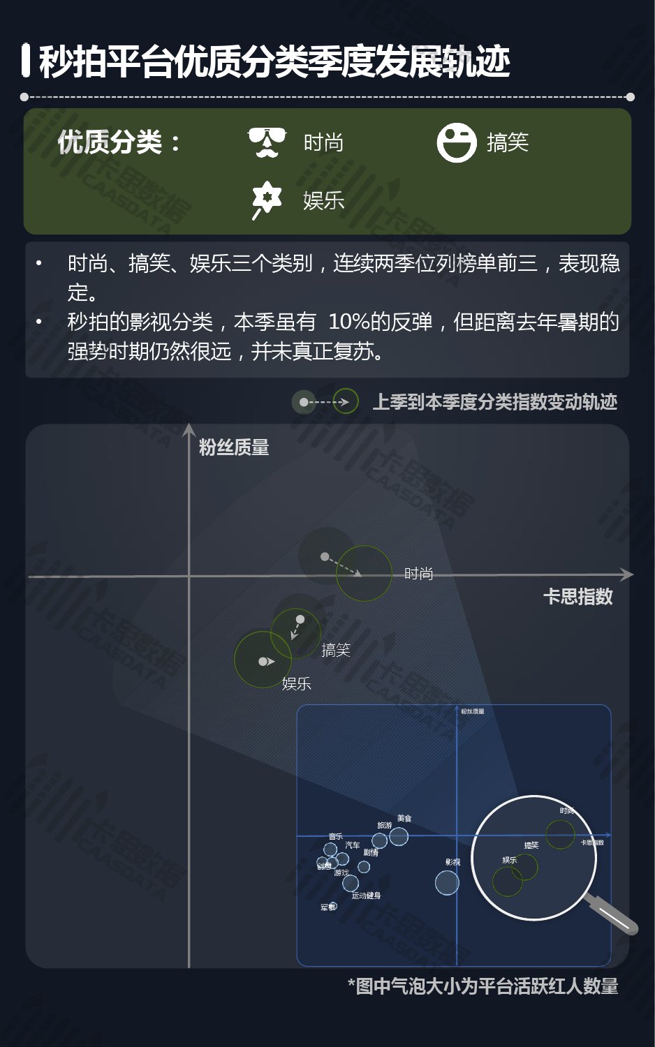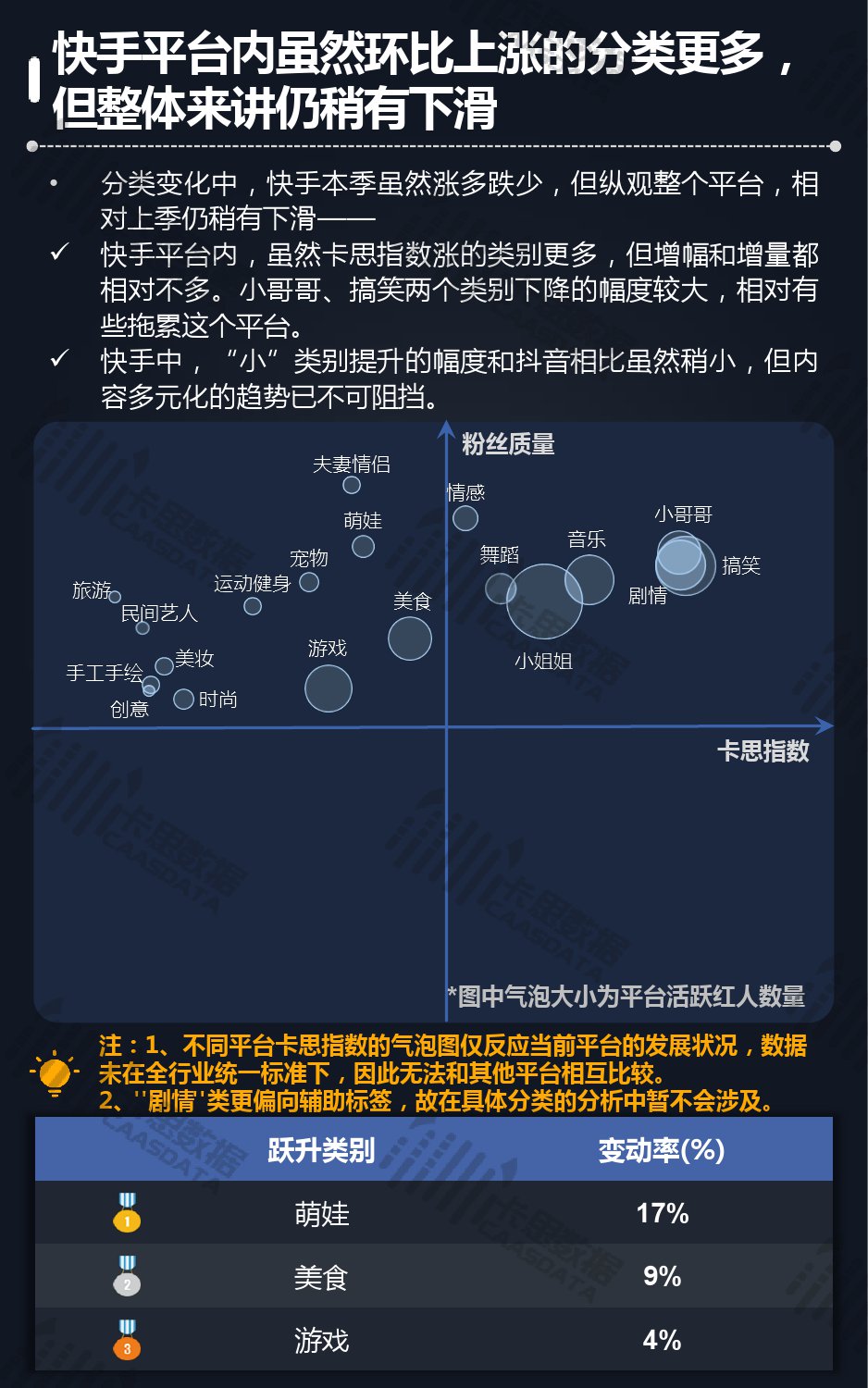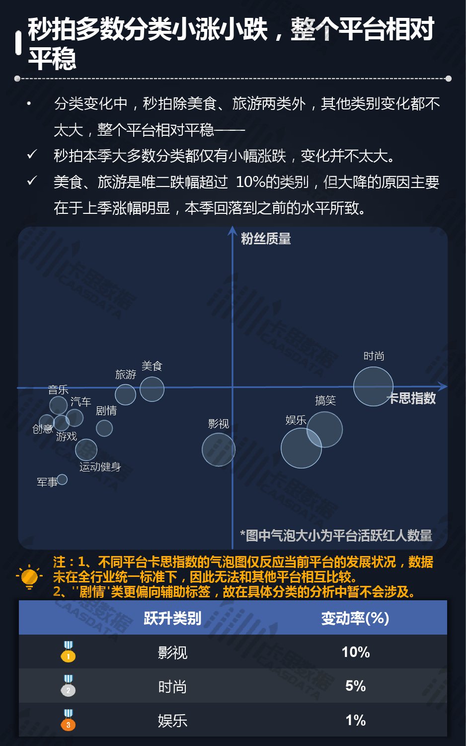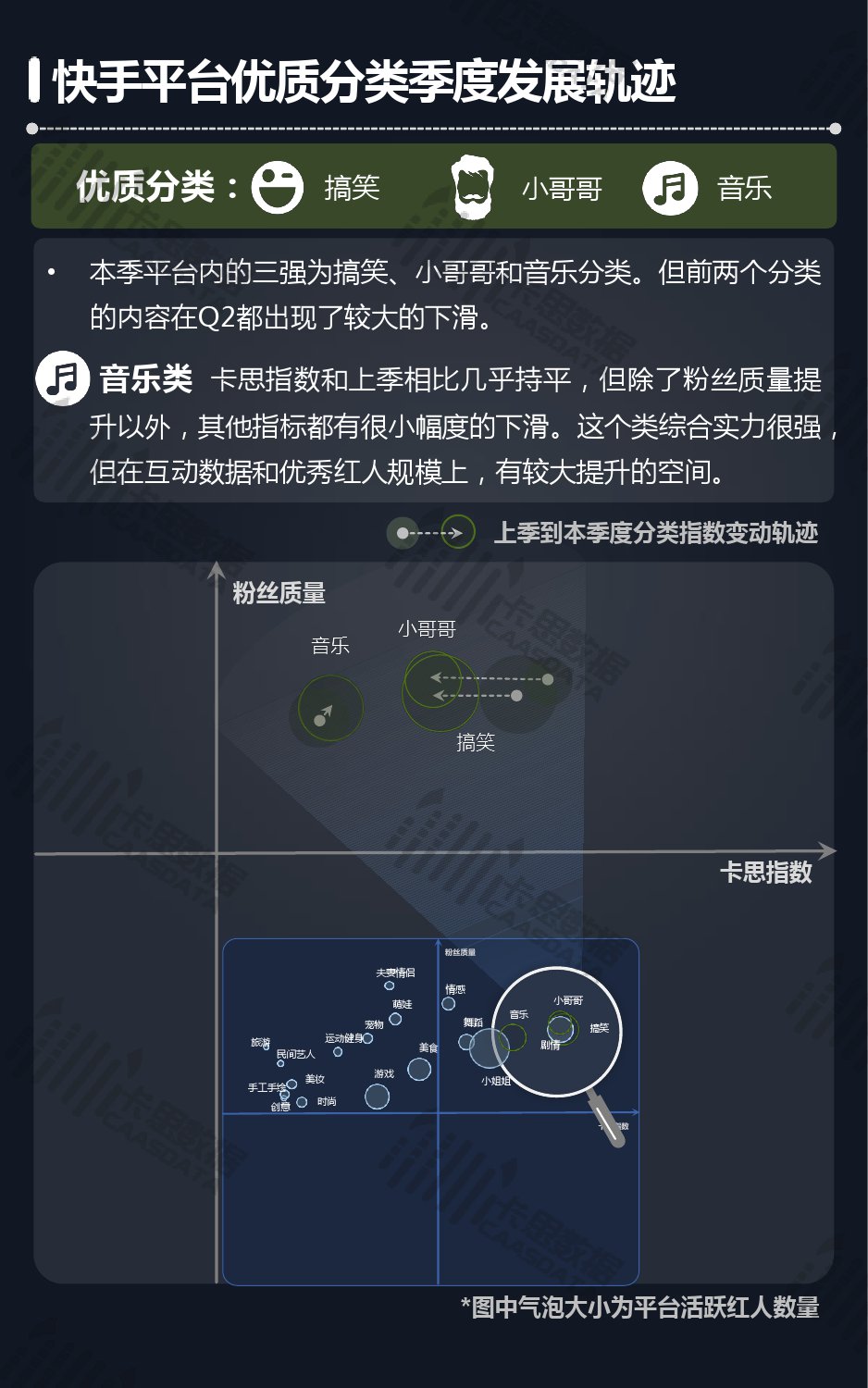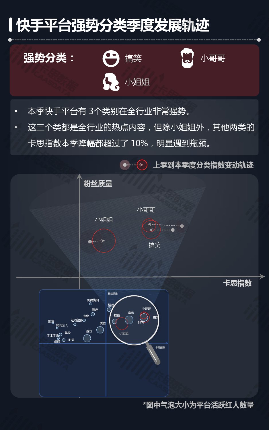14个细分分类中,搞笑类、小哥哥、音乐舞蹈、小姐姐四类仍然在行业内领先,但优势在逐步缩小,搞笑类持续排名榜首,但和上季相比,卡思指数下降了13%; 影视娱乐和生活休闲两类本季卡思指数大涨,综合实力提升明显; 社科军工类连续几季卡思指数增幅很大,但整体发展性依然不足。