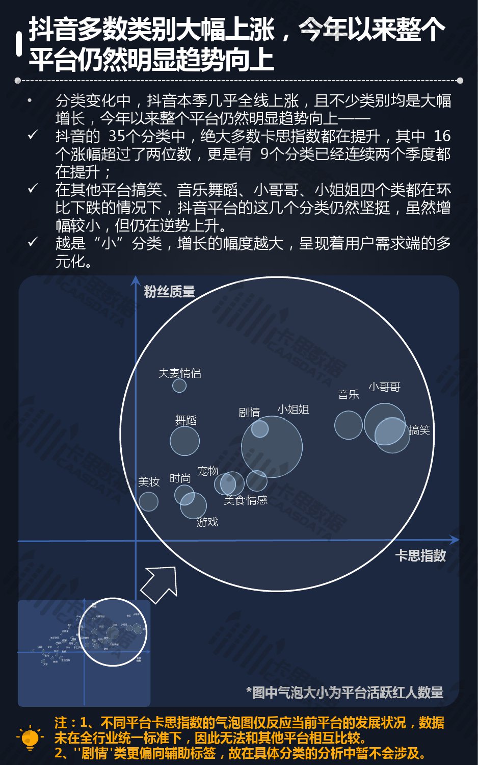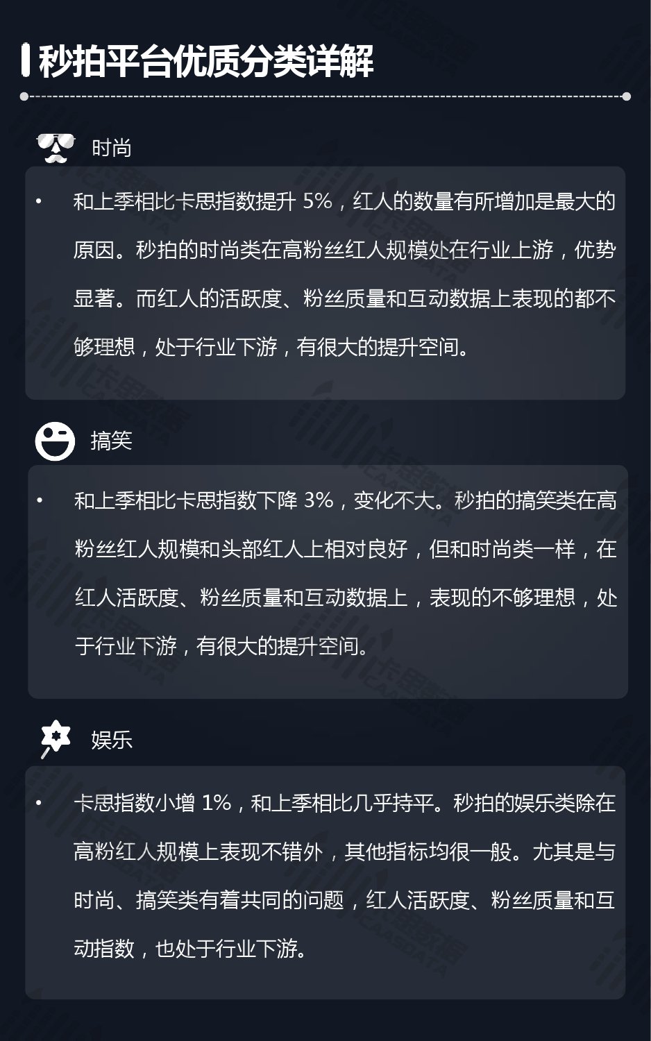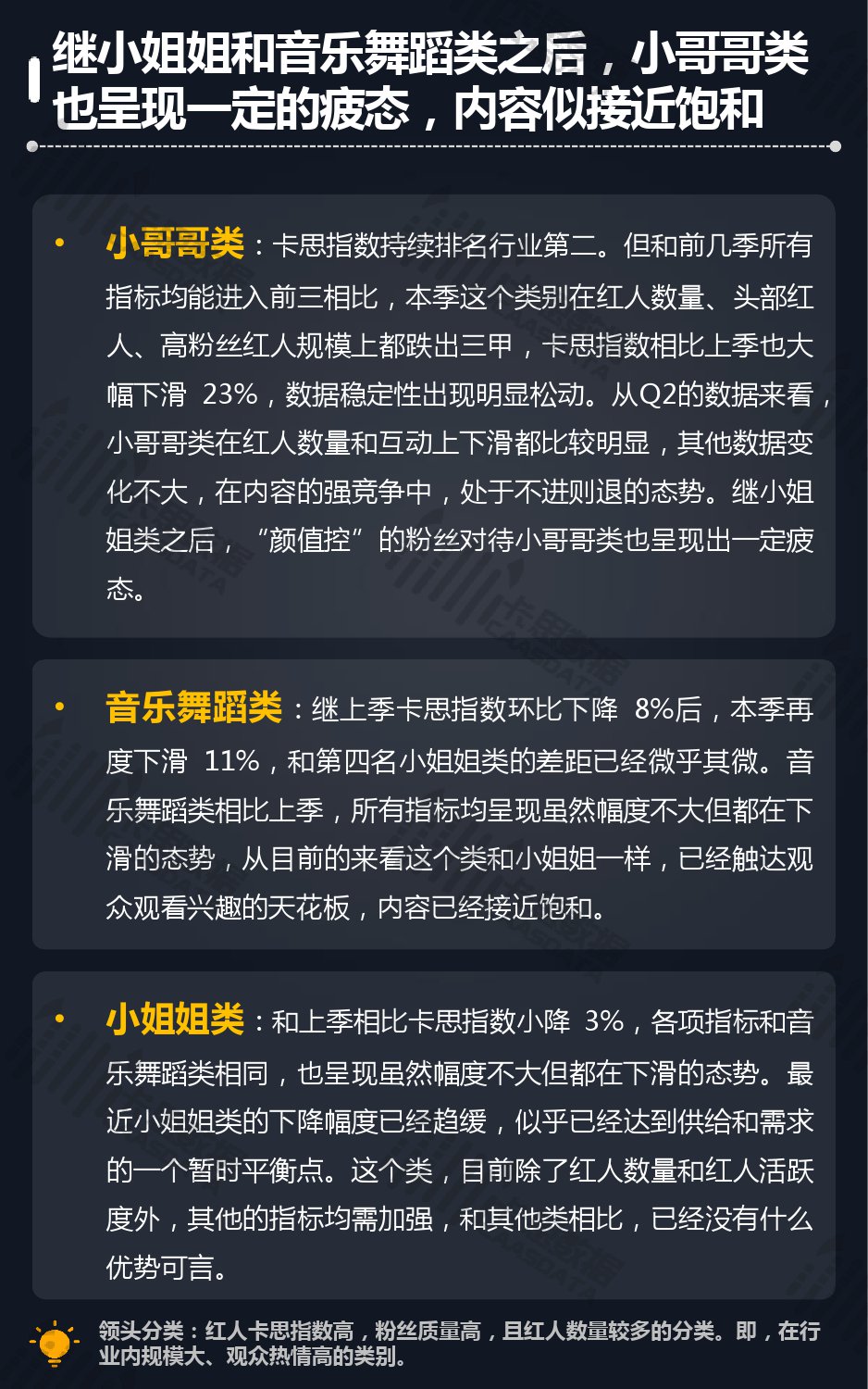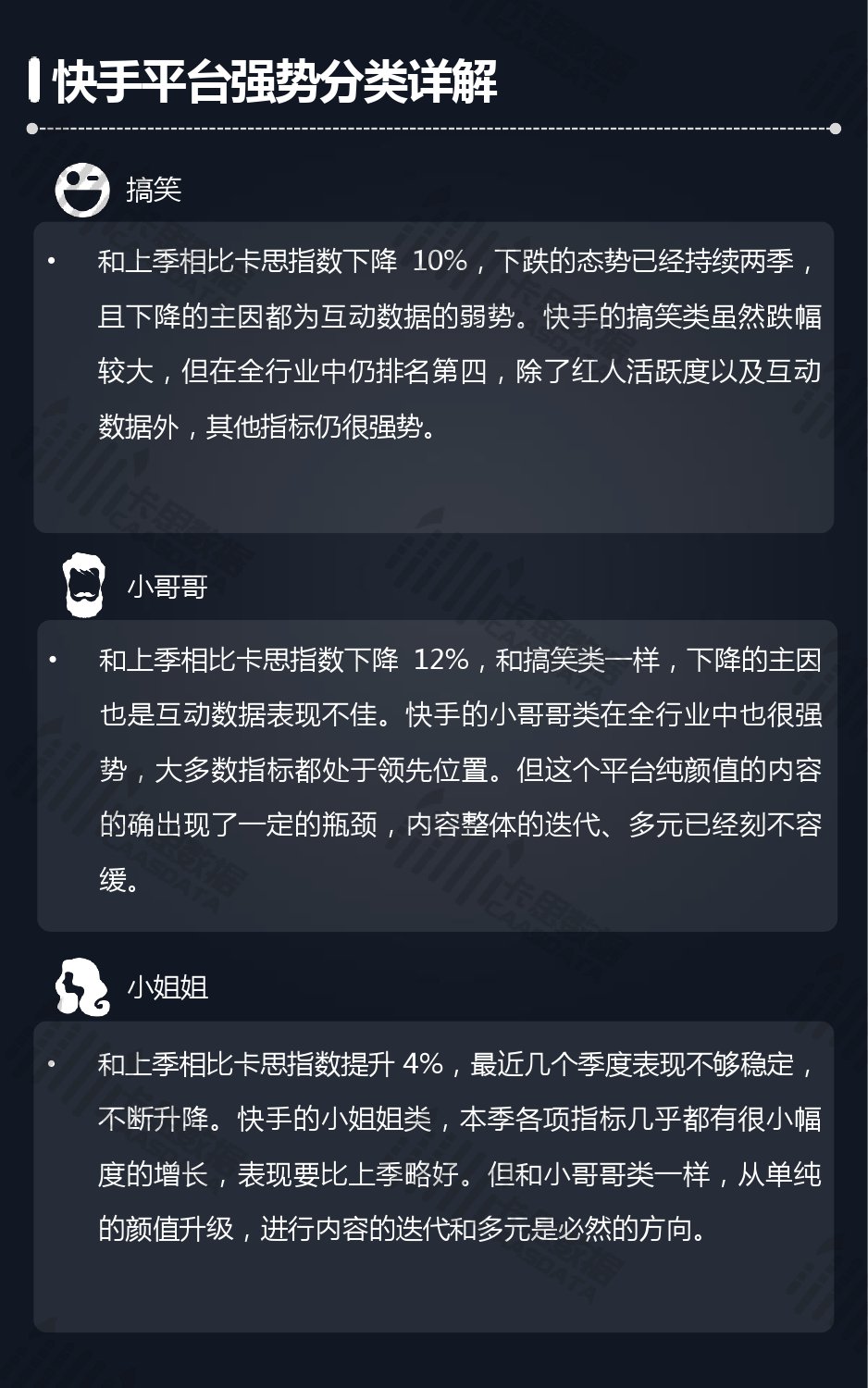 14个细分分类中,搞笑类、小哥哥、音乐舞蹈、小姐姐四类仍然在行业内领先,但优势在逐步缩小,搞笑类持续排名榜首,但和上季相比,卡思指数下降了13%; 影视娱乐和生活休闲两类本季卡思指数大涨,综合实力提升明显; 社科军工类连续几季卡思指数增幅很大,但整体发展性依然不足。