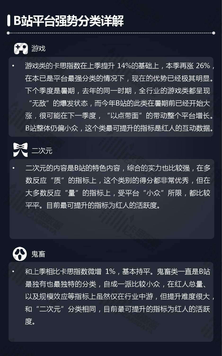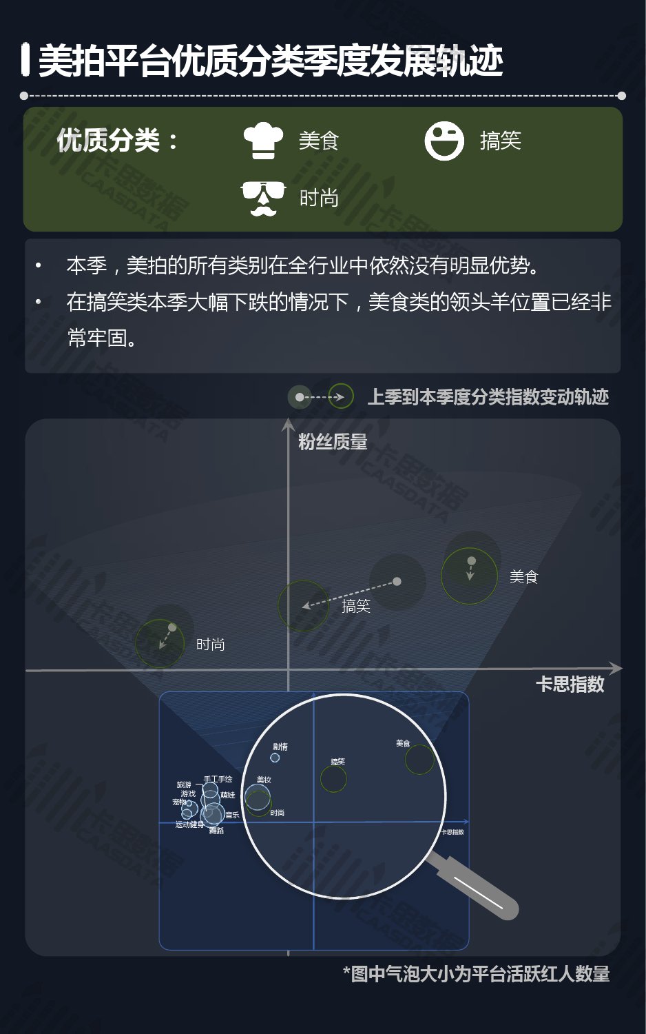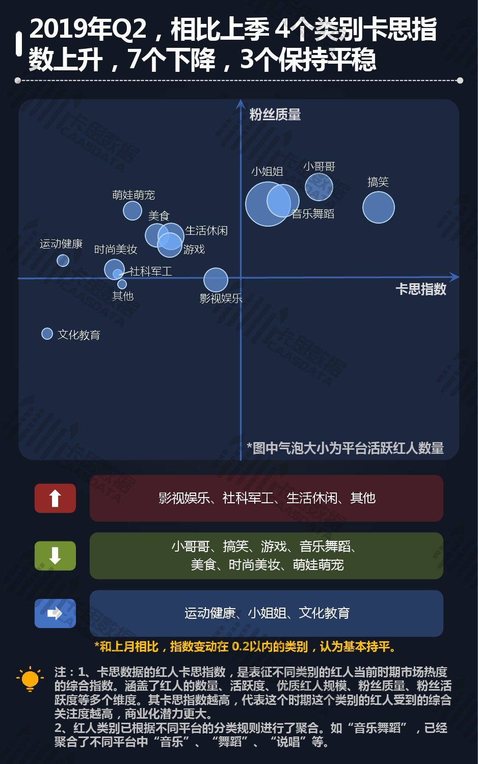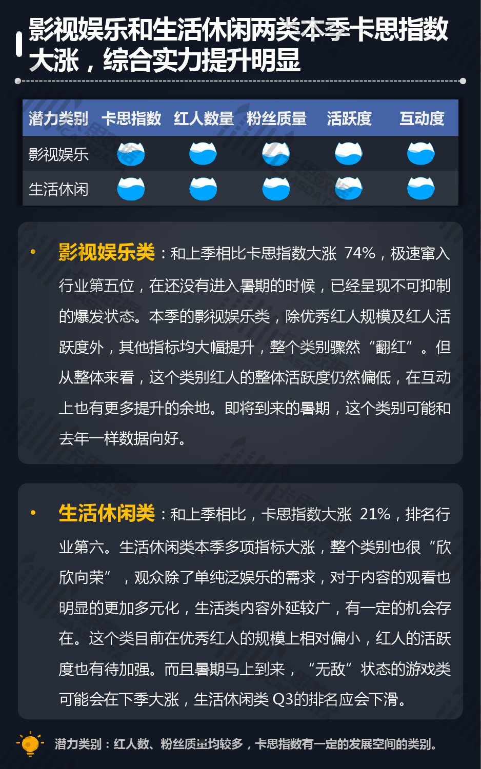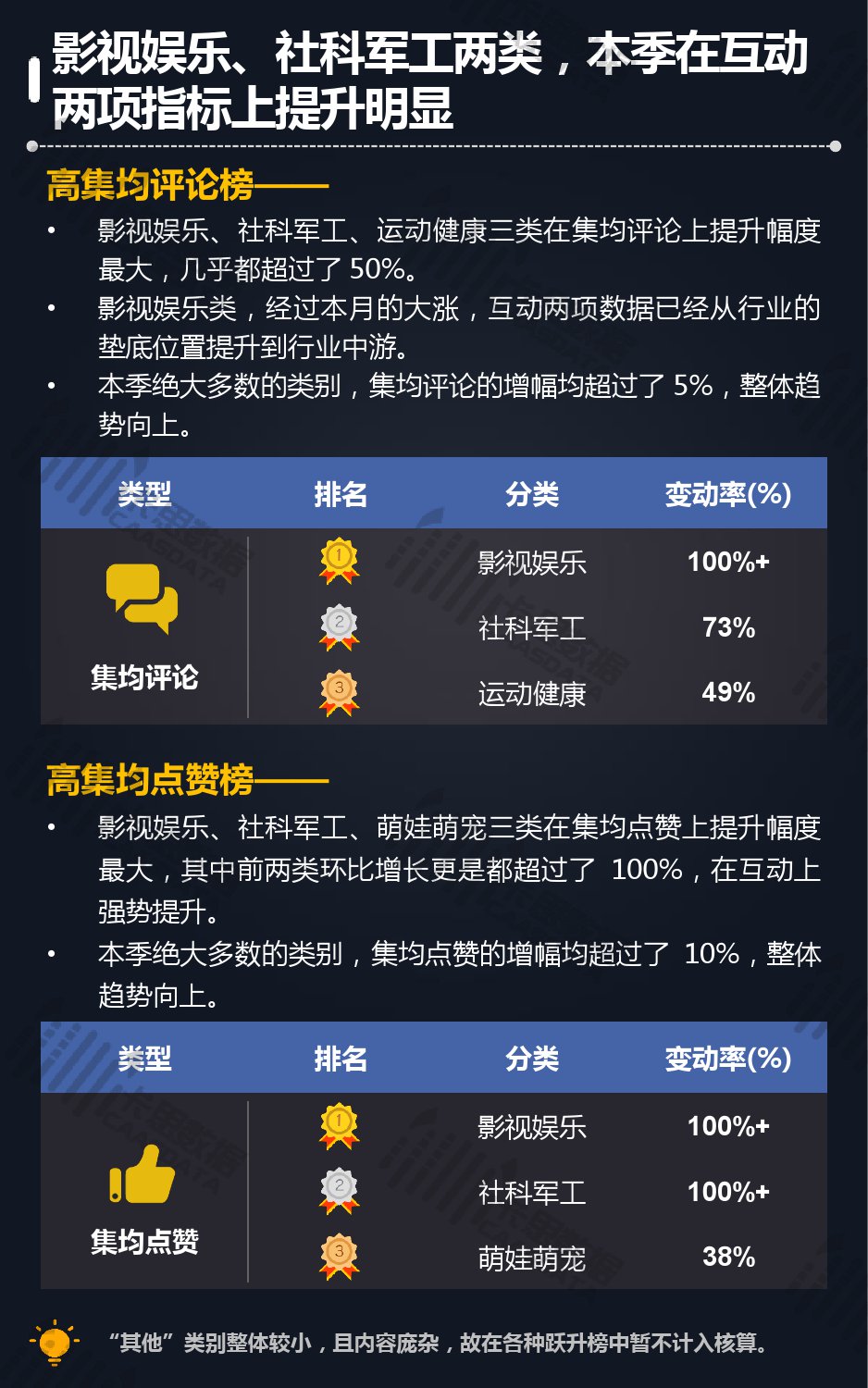 14个细分分类中,搞笑类、小哥哥、音乐舞蹈、小姐姐四类仍然在行业内领先,但优势在逐步缩小,搞笑类持续排名榜首,但和上季相比,卡思指数下降了13%; 影视娱乐和生活休闲两类本季卡思指数大涨,综合实力提升明显; 社科军工类连续几季卡思指数增幅很大,但整体发展性依然不足。