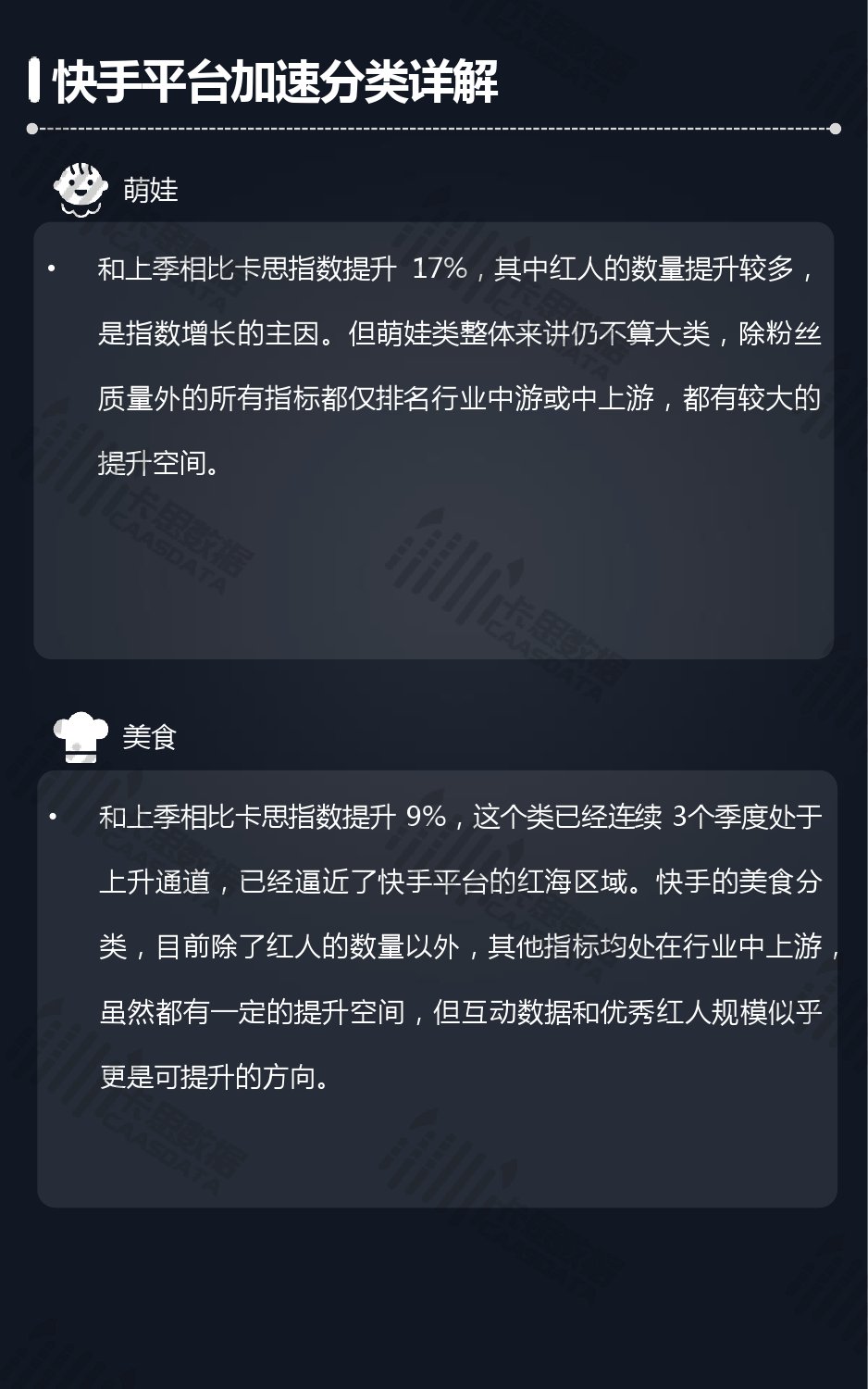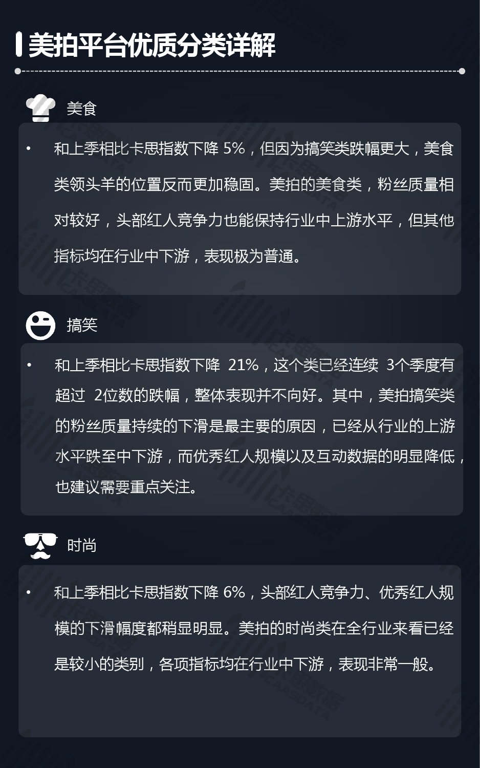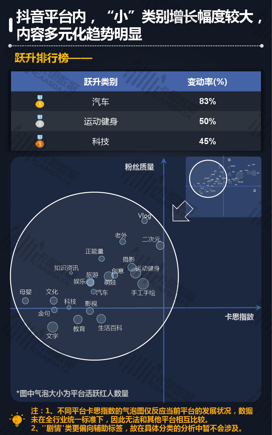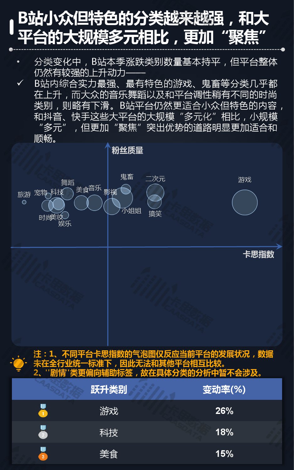 14个细分分类中,搞笑类、小哥哥、音乐舞蹈、小姐姐四类仍然在行业内领先,但优势在逐步缩小,搞笑类持续排名榜首,但和上季相比,卡思指数下降了13%; 影视娱乐和生活休闲两类本季卡思指数大涨,综合实力提升明显; 社科军工类连续几季卡思指数增幅很大,但整体发展性依然不足。