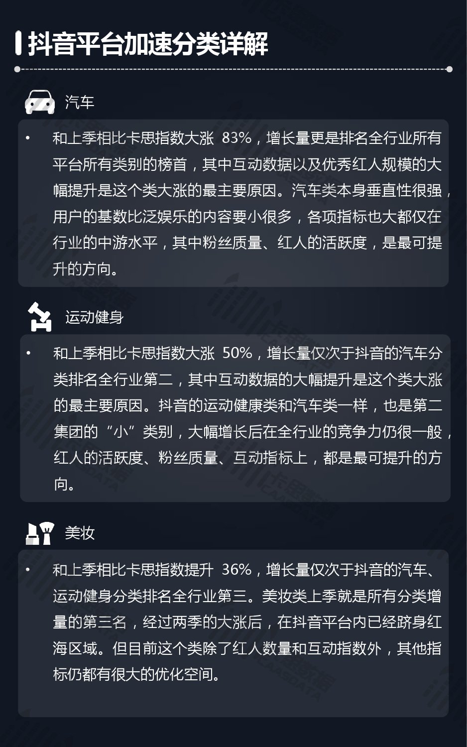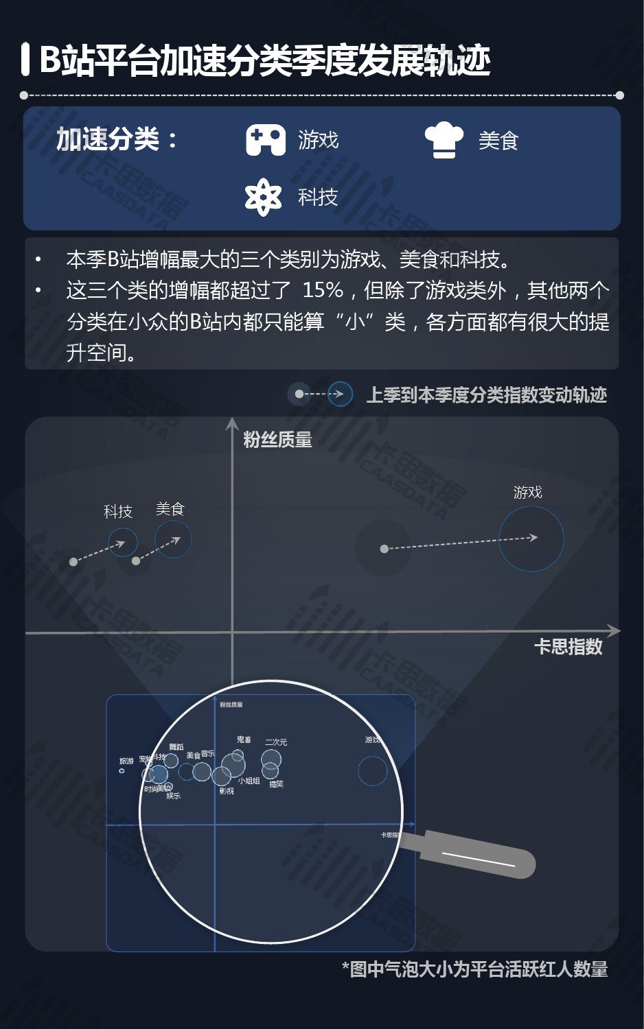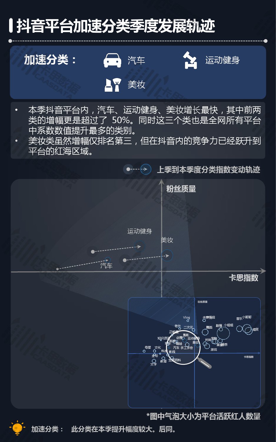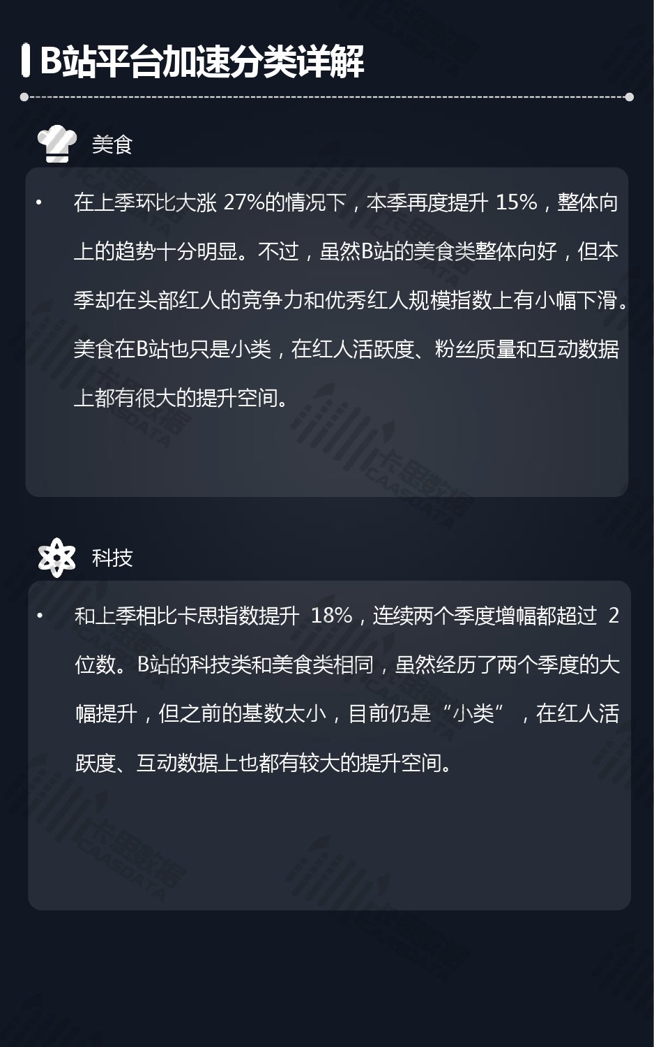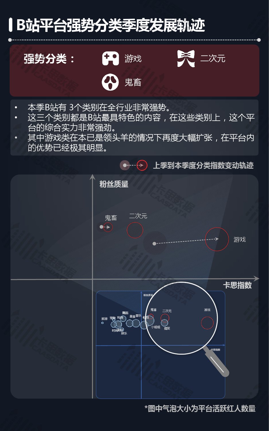 14个细分分类中,搞笑类、小哥哥、音乐舞蹈、小姐姐四类仍然在行业内领先,但优势在逐步缩小,搞笑类持续排名榜首,但和上季相比,卡思指数下降了13%; 影视娱乐和生活休闲两类本季卡思指数大涨,综合实力提升明显; 社科军工类连续几季卡思指数增幅很大,但整体发展性依然不足。