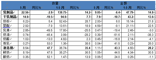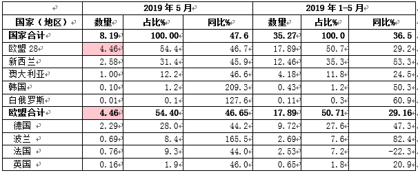 2019年1-5月干乳制品出口1.18万吨,同比增长71%