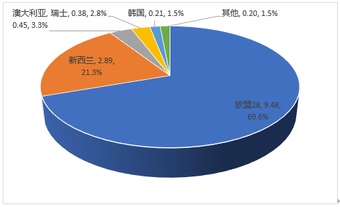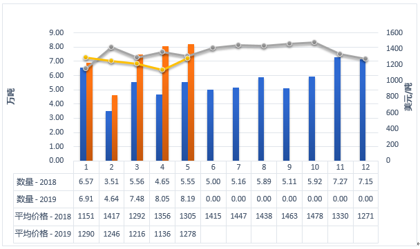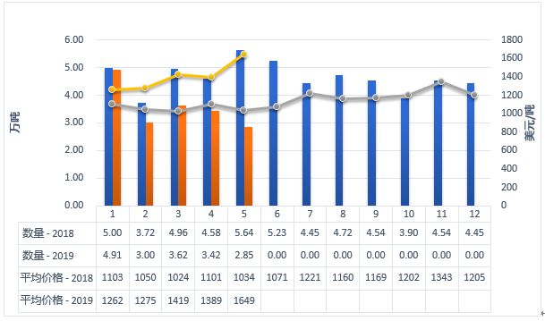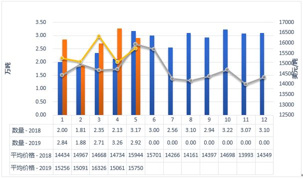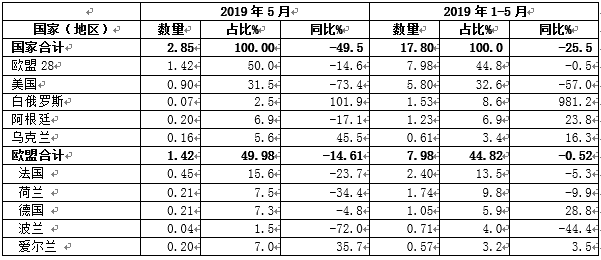 2019年5月中国进口2.92万吨,同比减少7.9%,进口额4.59亿美元,同比下降9.1%,平均价格为15750美元/吨,同比下降1.2%。其中,从欧盟进口2.02万吨,占69.1%,同比减少13.4%;从新西兰进口0.69万吨,占23.7%,同比增加25.9%;从澳大利亚进口0.1万吨,占3.6%,同比减少34.2%。