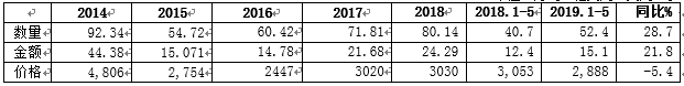 2019年1-5月进口婴配粉13.61万吨,同比增长18.9%
