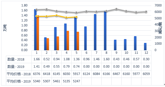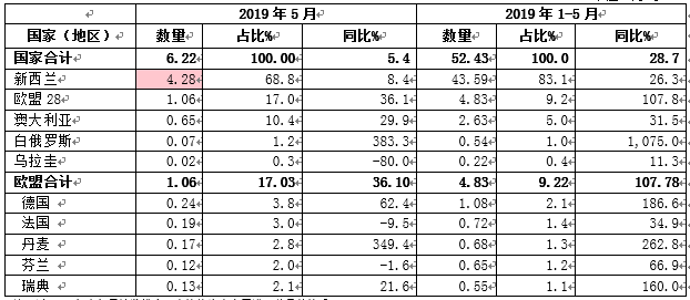 2019年5月中国进口0.74万吨,同比减少45.4%,进口额0.39亿美元,同比下降51.6%,平均价格为5247美元/吨,同比下降11.3%。其中,从新西兰进口0.62万吨,占83.2%,同比减少51.1%,从欧盟进口0.1万吨,占13.3%,同比增加11%。