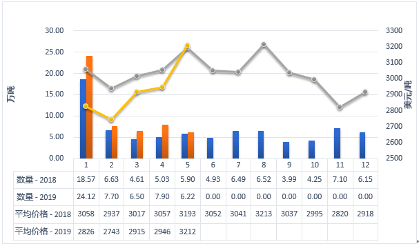 中国婴幼儿配方奶粉月度进口量及价格2018-2019