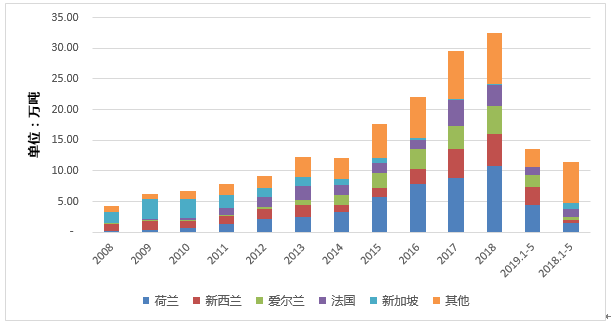 中国婴幼儿配方奶粉进口量及来源国变化2008-2019