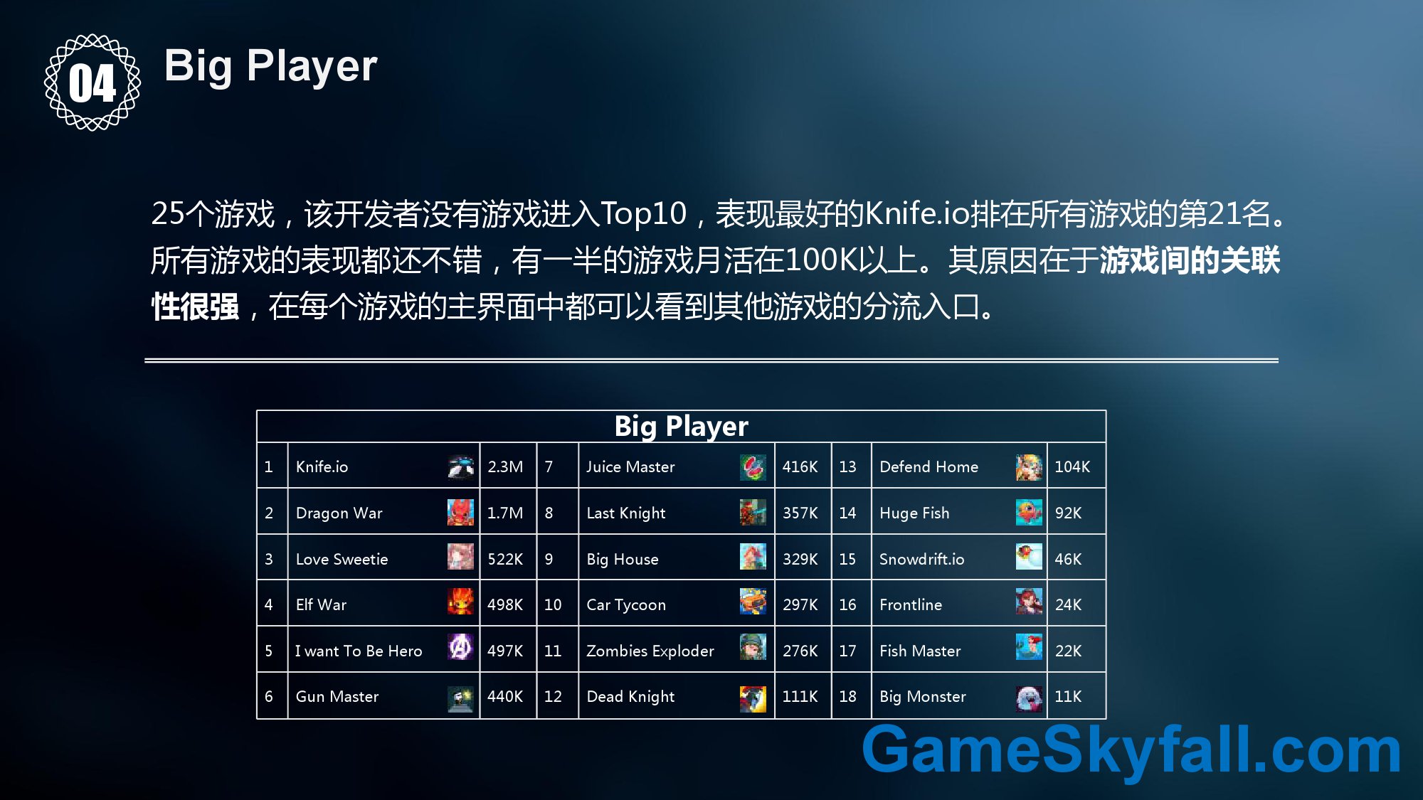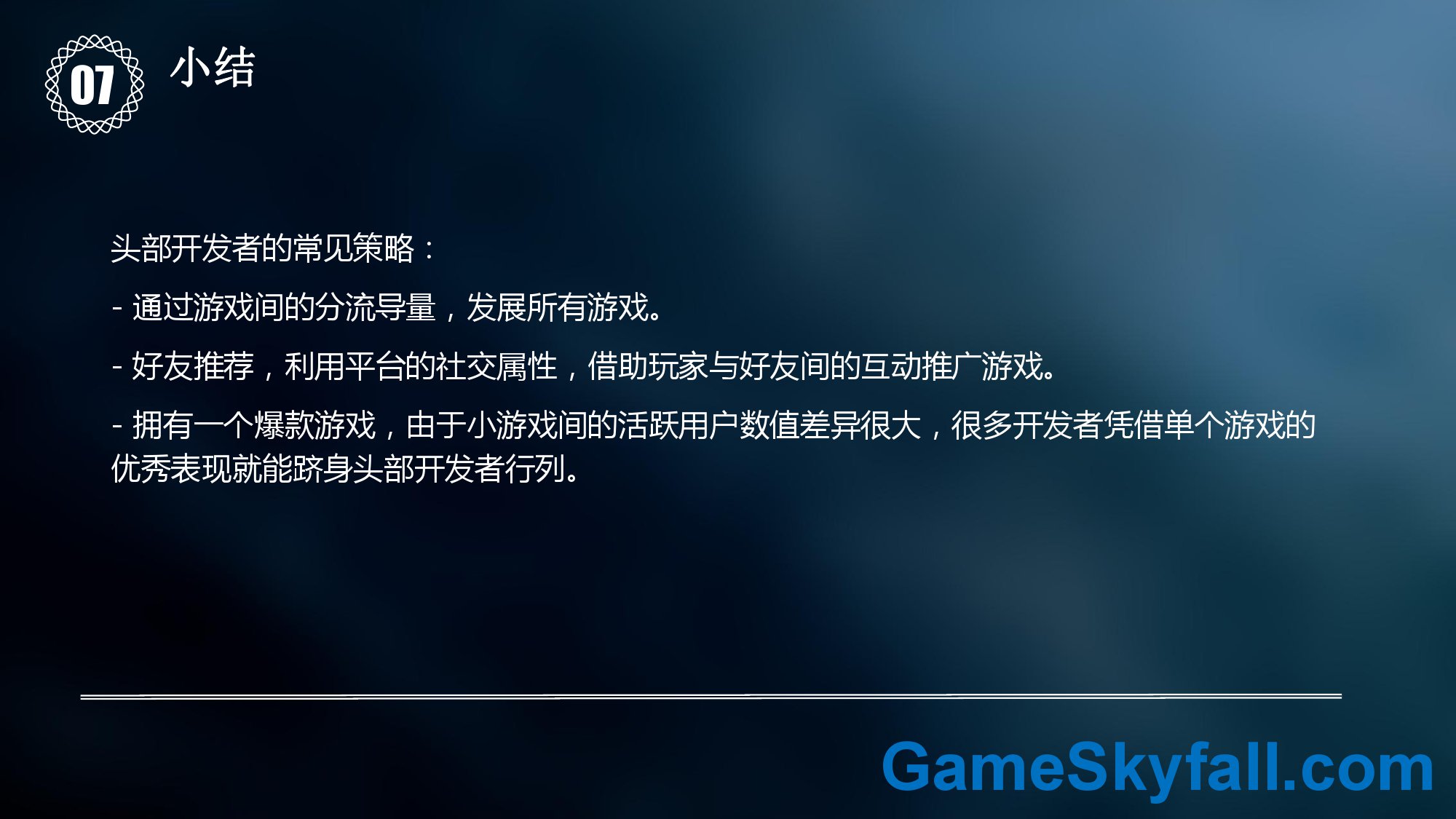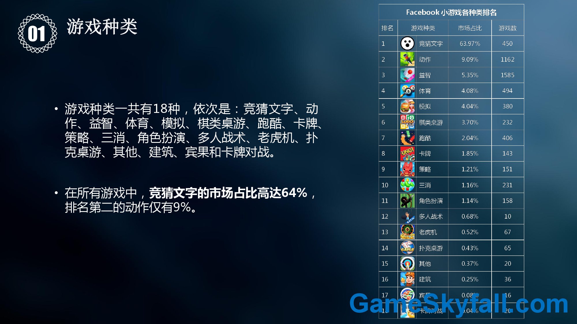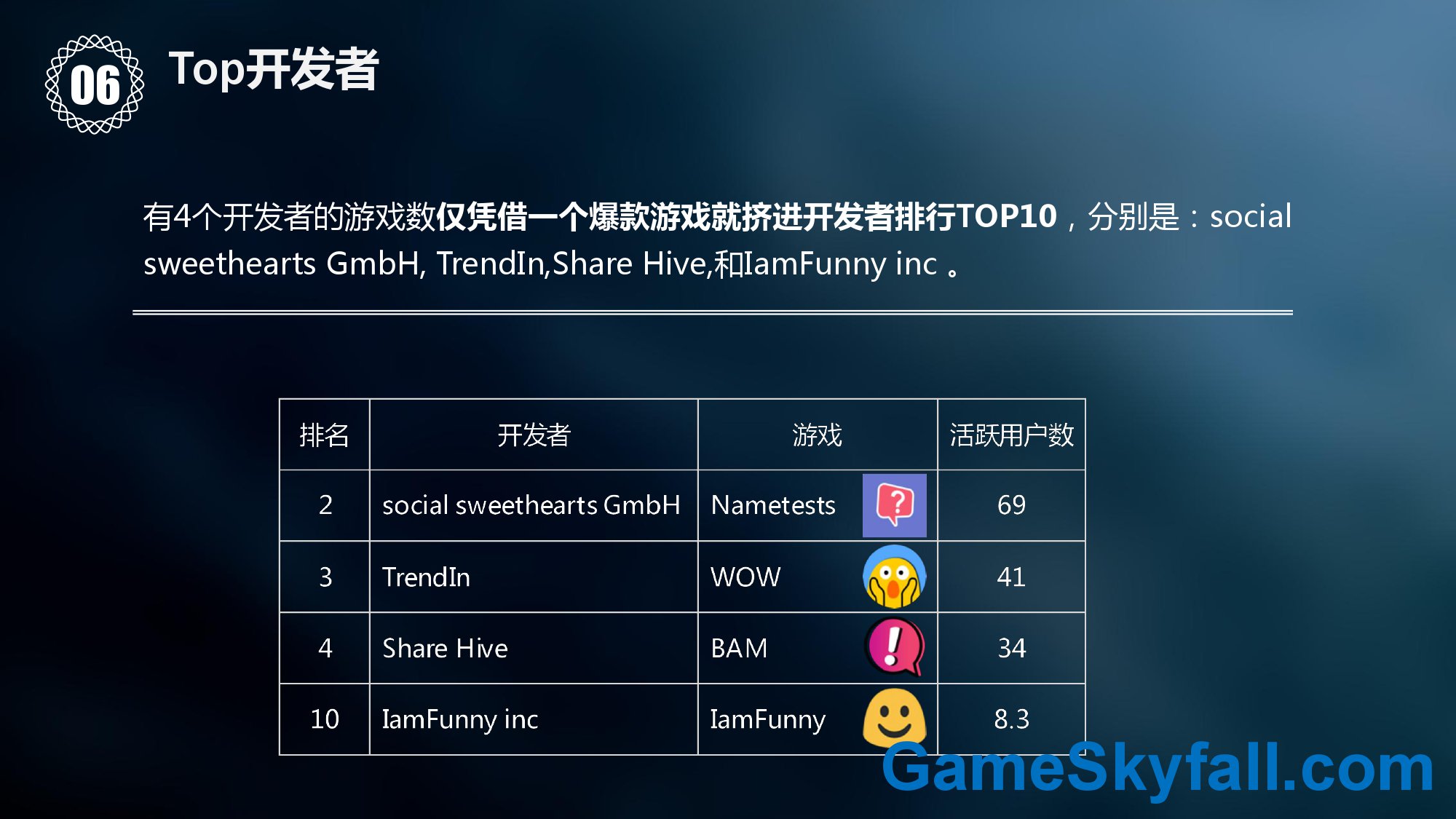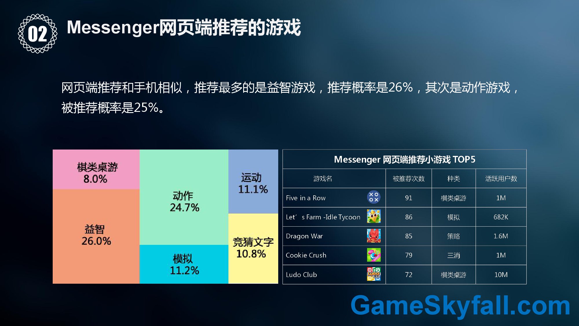 GameSkyfall:Facebook小游戏年中报告 PDF版本将分享到199IT交流群,支持我们发展可加入! 更多阅读:GameSkyfall:2019年第一季度Facebook小游戏的活跃用户超过9亿Facebook:2021年游戏营销洞察资讯Christian Fager:阐述在Facebook展开游戏广告推广的要点AppData:2012年6月前25名Facebook游戏排行榜Facebook:2011年度Facebook最受欢迎社交游戏排行榜AppData:2012年2月Facebook TOP25社交游戏排行榜田中良和谈GREE发展历程及日本手机社交游戏Appdata:2012年9月Facebook游戏榜单Mashable:【社交游戏经济】数据信息视图socialgamesobserver:调查结果显示Facebook社交游戏玩家多为女性年龄介于19-25岁Facebook游戏团队:数据显示月均3.75亿人在Faceboook上玩游戏Facebook社交游戏会就此衰亡吗?Facebook:每月有2.35亿用户在平台上玩游戏PocketGamer:社交游戏发行商在社交网络上的粉丝数据Facebook月游戏玩家达2亿3千5百万