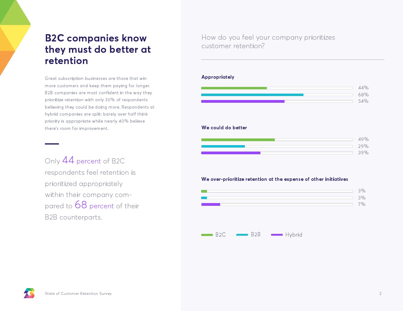 2/3的B2B企业领袖(68%)相信他们的公司适当地优先考虑客户保留,但29%的受访者认为他们可以做得更好。另一方面,一半的B2C企业领袖(49%)认为他们的公司可以做得更好,只有少部分人(44%)认为他们正在以客户保留为首要任务。