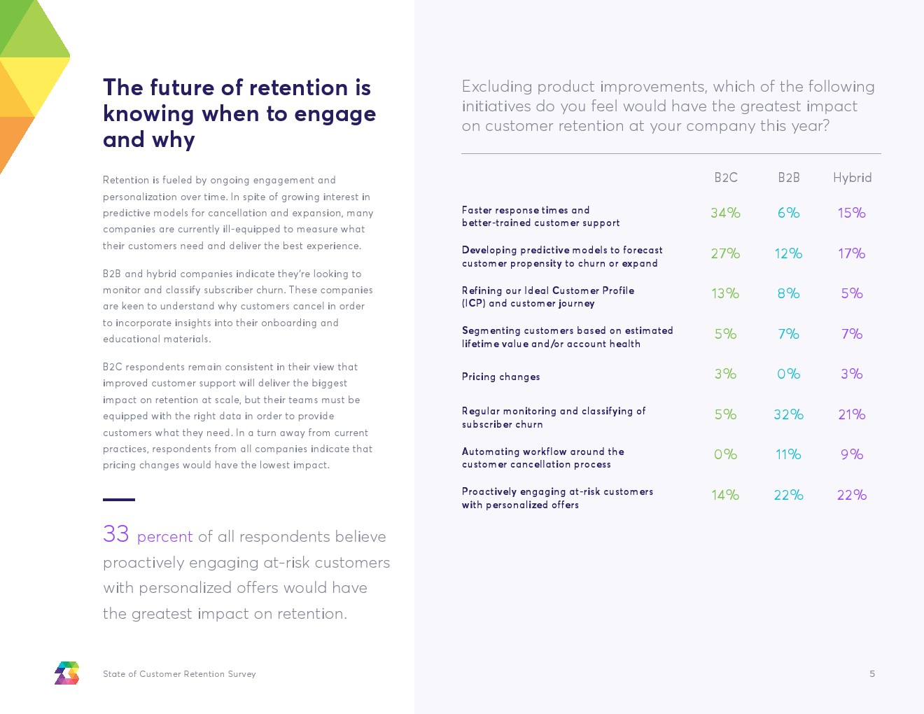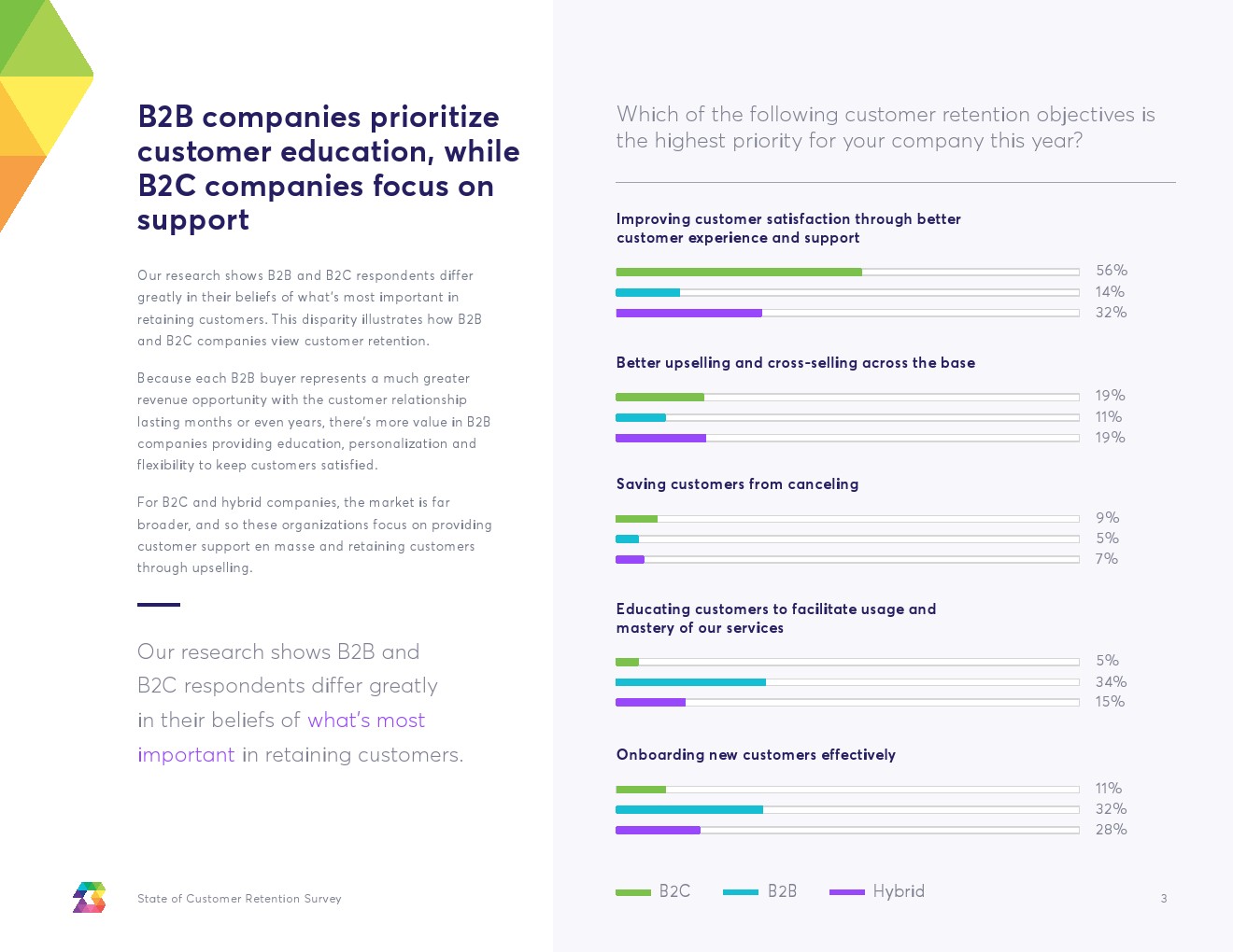 B2B和B2C业务是不同的。当涉及到客户保留有最大影响的计划时,1/3的B2C受访者(34%)认为更快的响应和更好的客户支持对他们的客户保留率产生最大的影响。约1/3的B2B受访者(32%)将定期监控和分类用户流失作为最具影响力的举措。