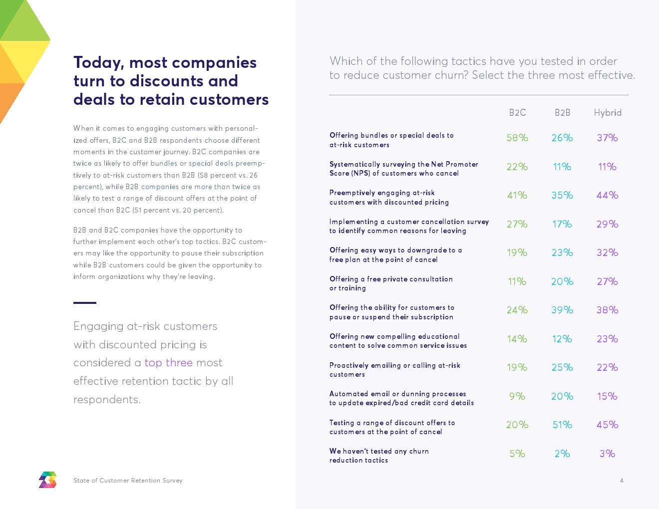 根据Brightback的调查,约5/3的B2C受访者认为(58%)提供高风险客户捆绑或特殊交易的方法有效。在B2B和混合业务方面,分别有51%和45%的受访者认为向客户提供的一系列折扣优惠是最有效的策略之一。