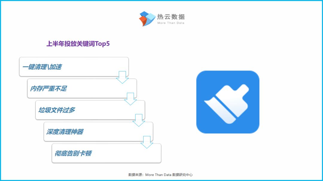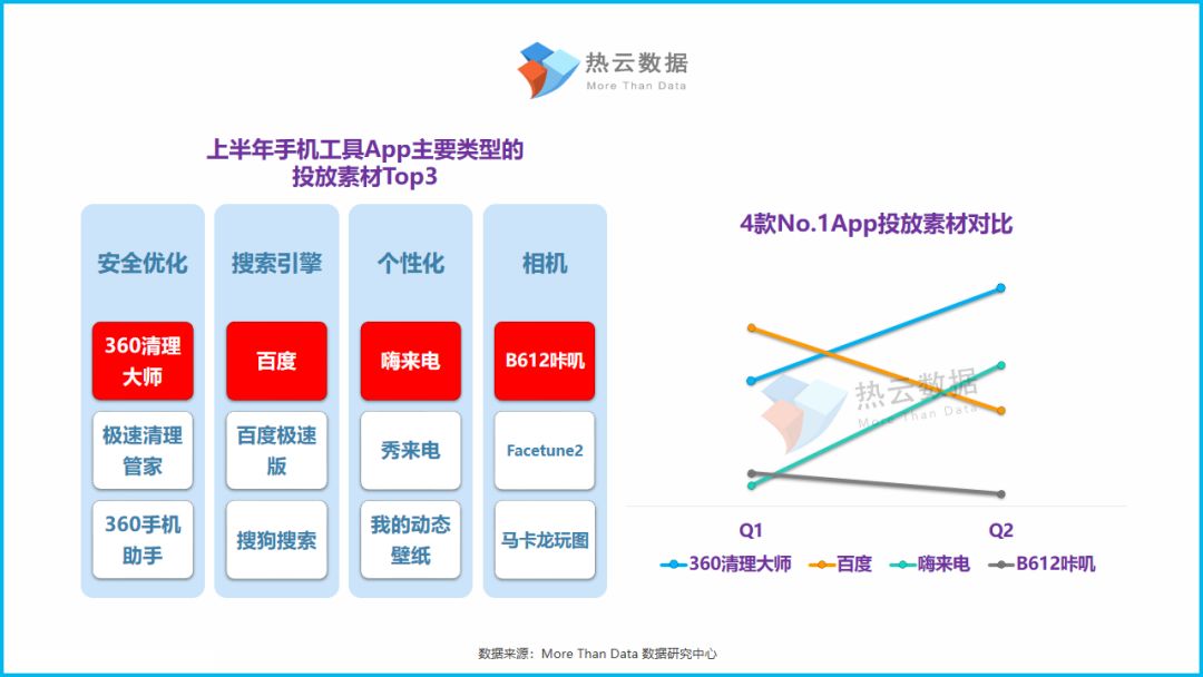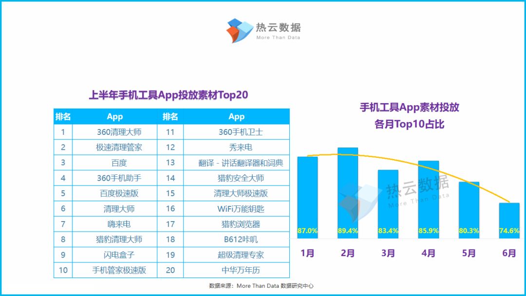 ●360清理大师、极速清理大师、百度是今年上半年投放素材量最高的3款手机工具类App;