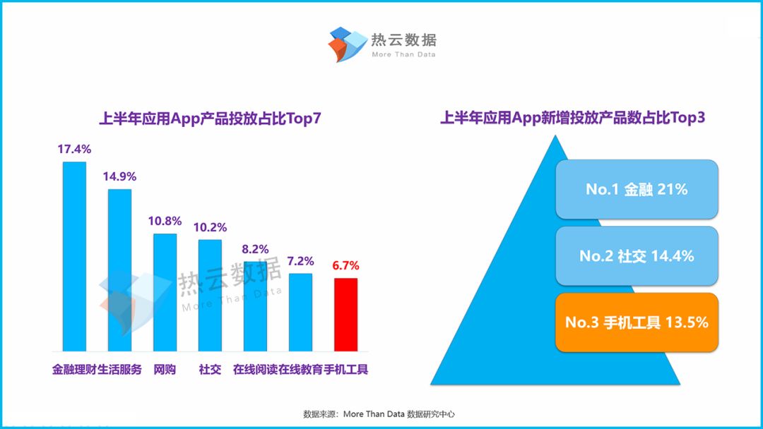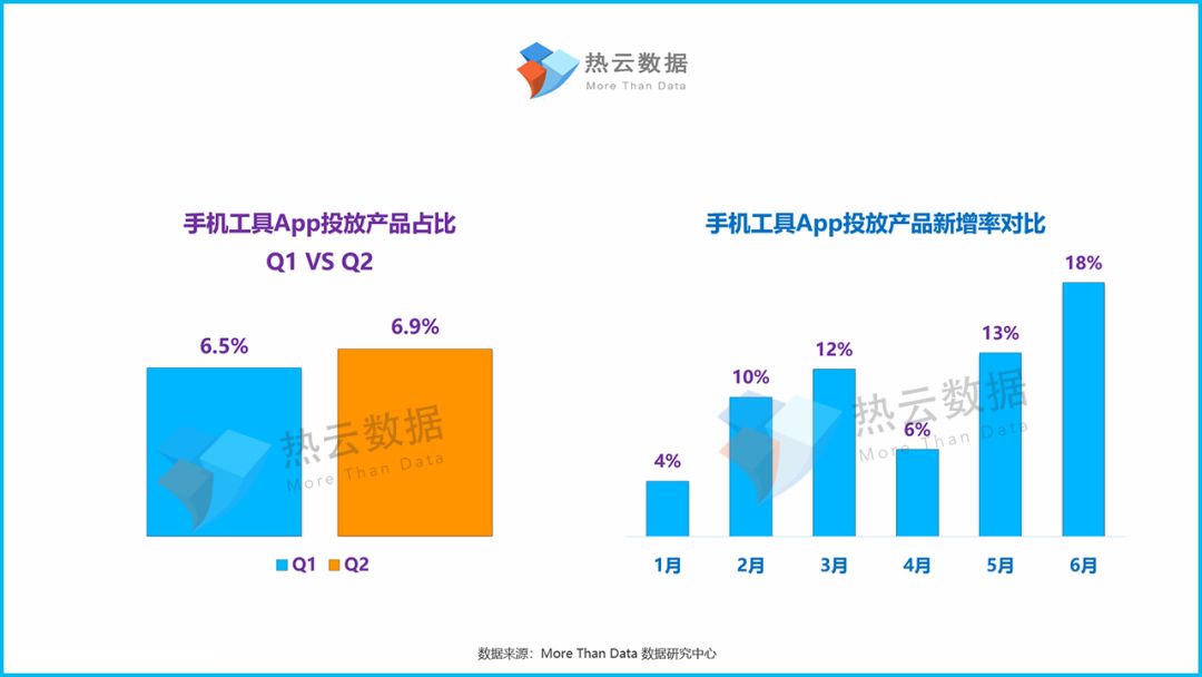 根据热云数据监测,2019上半年手机工具类App的投放产品数量占比为6.7%,位居在线教育类App之后,排名第七;但从上半年投放产品维度的增量上看,手机工具类App的占比排名比较靠前,成为新增投放产品数量第三的应用App类型。