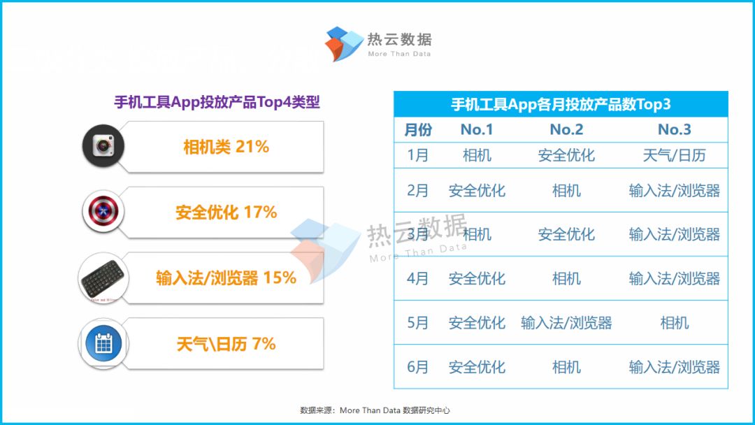相机类App是上半年投放产品数量最多的手机工具App,比例达到21%,安全优化类App位居其次。同时,该两类App在上半年各月一直交替位居投放产品数No.1。