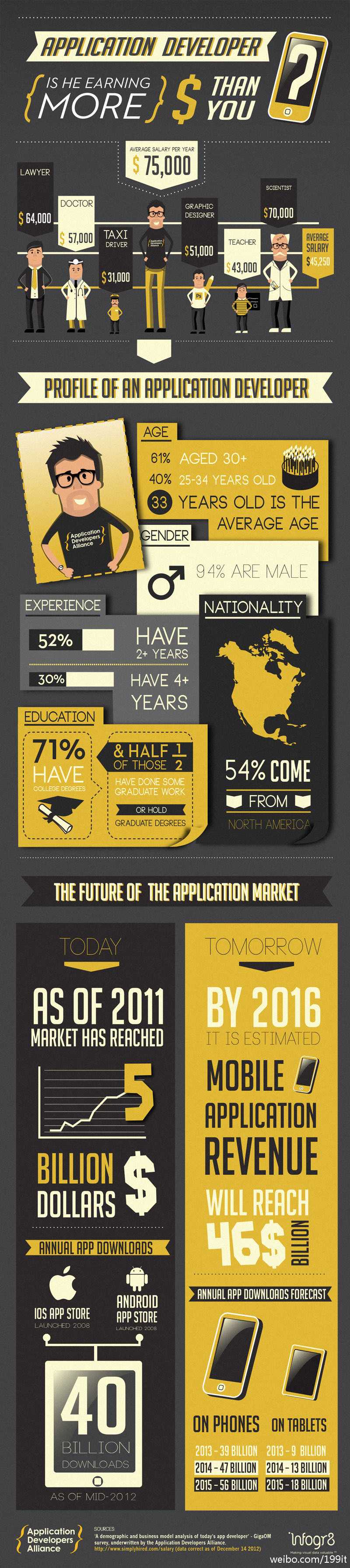 北美移动开发者收入超过律师和科学家–数据信息图 【北美移动开发者收入超过律师和科学家】开发当生在米国,下面这张信息视图说移动开发者平均年收入为7.5万美元,超过科学家,律师等高薪行业! 更多阅读:VisionMobile:2013年移动开发者经济报告DCCI:2012中国移动应用开发者生存发展报告 DCCI:2012年移动应用生态数据分享 distimo:应用商店的商机2013年中国移动开发者研究报告–信息图孩子与科技(IPAD)–数据信息图VisionMobile:哪种App更赚钱VisionMobile:2012年移动互联市场趋势,跨平台开发工具VisionMobile:2012年全球移动开发者调查VisionMobile:2012年移动互联市场趋势,B2D淘金者的工具Dot Com Infoway:浅析移动应用软件现状–数据信息图Gartner:APP开发的游戏变得日趋艰难Visionmobile:欢迎进入移动开发者买彩票时代Visionmobile:开发一款成功的APP需要多少投入visionmobile:非经济因素是移动开发者开发应用的最普遍动力