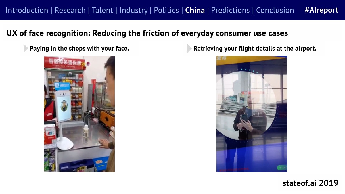 在中国,人脸识别技术已经开始应用。人们在店内刷脸支付,在机场获得航班详情等。