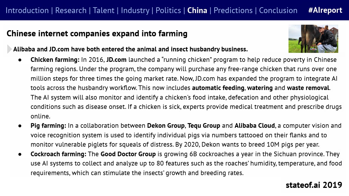阿里巴巴和京东都进入了畜牧业和昆虫养殖业,包括养鸡、养猪和蟑螂养殖。并在养殖过程中利用人工智能收集和分析数据。