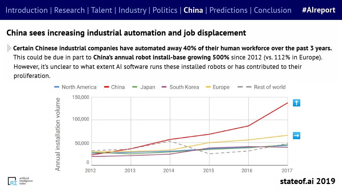 在过去的3年里,一些中国工业企业40%的劳动力已经实现自动化。这在一定程度上是因为中国的机器人年装机量自2012年以来增长了500%(欧洲为112%)。但是,目前还不清楚这些安装的机器人在多大程度上运行AI软件,或者对AI的普及做出了贡献。
