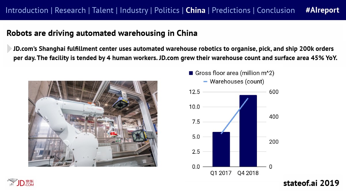 京东的上海配送中心使用自动化仓库机器人,每天组织、拣选和发货20万份订单,该设施仅由4名工人管理。京东的仓库数量和面积同比增长45%。