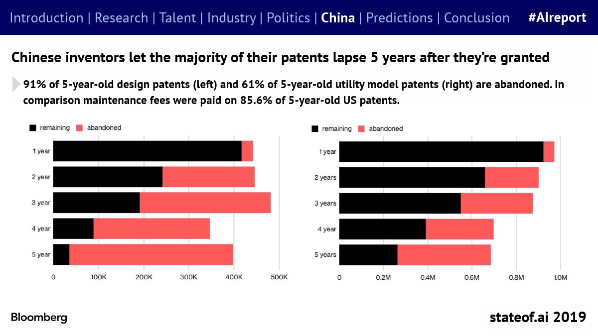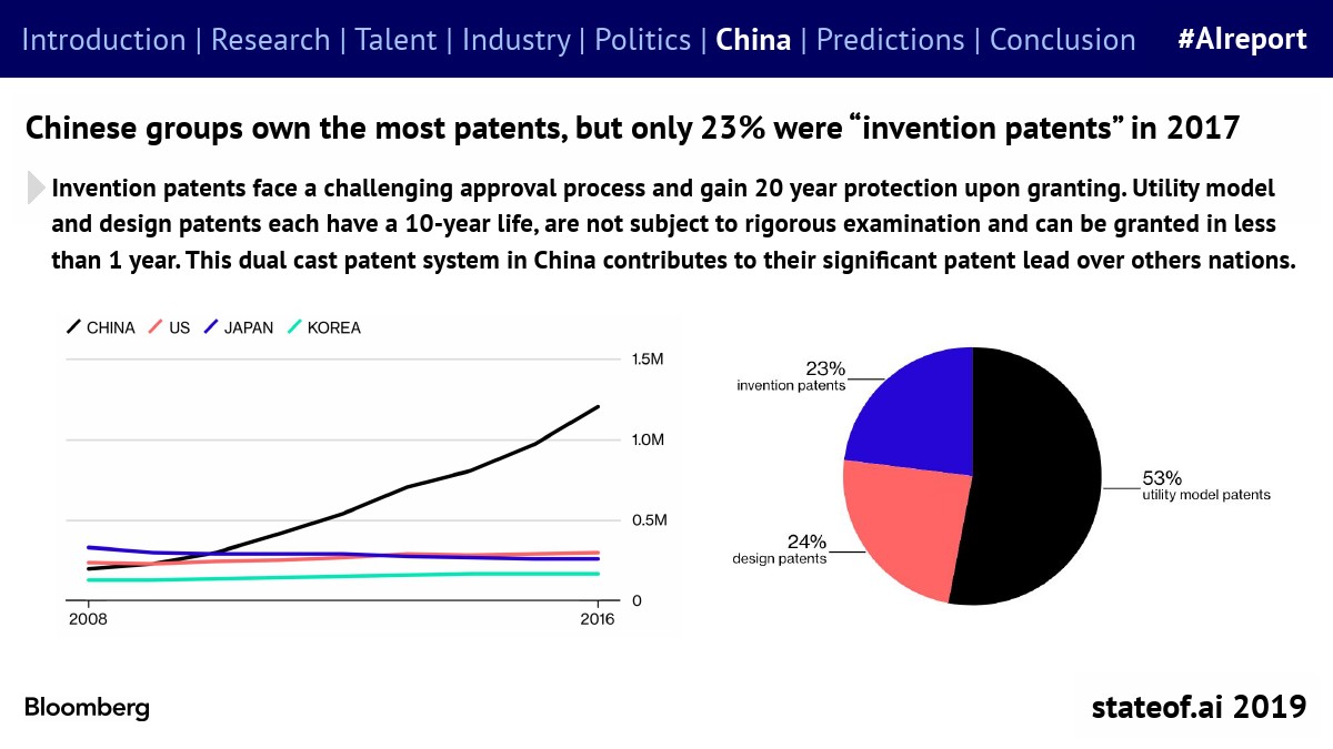 中国团体拥有最多的AI专利,但2017年只有23%是“发明专利”。