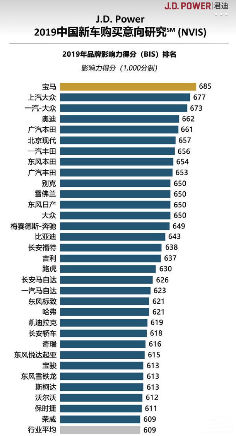 J.D. Power:2019中国新车购买意向研究 J.D. Power(君迪)发布2019中国新车购买意向研究。研究显示,中国消费者的购车预算和再购意愿均有下降,提供多样化的配置或能提高消费者的购车意愿。 这项研究还包括品牌影响力评分(BIS) ,品牌影响力得分(1,000分制)衡量汽车品牌在中国意向购车者中的熟悉度和喜好度。宝马(685分)的品牌影响力得分最高,其次是上汽大众(677分)和一汽大众(673分)。 排名前五名中,前四名都是德系品牌,整个表格中德系品牌还有大众、梅赛德斯-奔驰、斯柯达、保时捷。 更多阅读:J.D. Power:2014年中国新车购买意向研究J.D. Power:2014年中国汽车售后服务满意度研究J.D. Power:2021年中国新车购买意向 超六成95后想买国产车J.D. Power:2022中国新车购买意向研究J.D. Power:2016年中国新车质量研究J.D. Power:2015年中国售后服务满意度研究J.D. Power:2013年中国新车轮胎满意度研究迈点网:2014年7月中国酒店业高端品牌发展研究中智盟:2013年中国智能电视产业发展研究艺恩咨询:2014中国电影市场影响力研究中国城市消费者研究:网络化生活方式正在形成ZDC:2015-2016年中国镜头市场研究ZDC:2015年10月中国机箱市场研究ZDC:2015-2016年中国机箱市场年度研究CTR:中国母婴电商研究