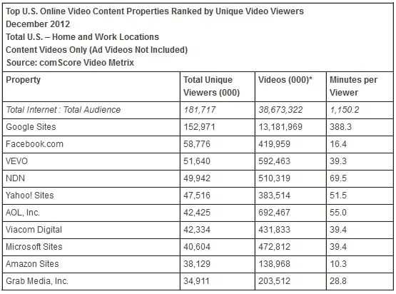 2012年1月15日上午消息,comScore周一发布了2012年12月美国网络视频市场的数据。12月,1.82亿美国互联网用户观看了387亿次内容视频及113亿次广告视频。