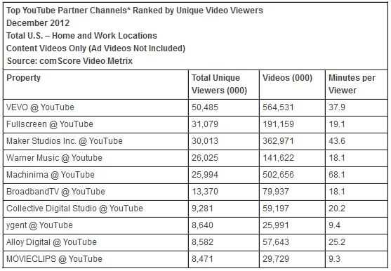 12月,YouTube的合作伙伴数据显示,音乐视频频道Vevo是YouTube排名第一的合作伙伴,观众数量为5050万。Fullscreen首次上升至第2,观众数量为3110万。随后分别为Maker Studio的3000万、华纳音乐的2600万和Machinima的2600万。在YouTube前10大合作伙伴中,Machinima有着最高的用户参与度,每用户观看视频时长为68分钟,随后为Maker Studio,每用户观看视频时长为44分钟。Vevo的视频播放次数最多,为5.65亿次,Machinima以5.03亿次排名第2。