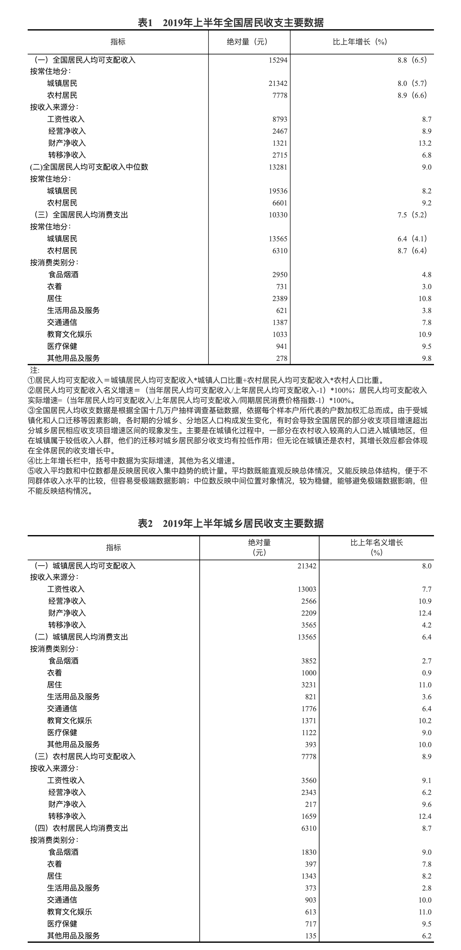 2019年上半年,全国居民人均可支配收入15294元,比上年同期名义增长8.8%,扣除价格因素,实际增长6.5%。其中,城镇居民人均可支配收入21342元,增长(以下如无特别说明,均为同比名义增长)8.0%,扣除价格因素,实际增长5.7%;农村居民人均可支配收入7778元,增长8.9%,扣除价格因素,实际增长6.6%。