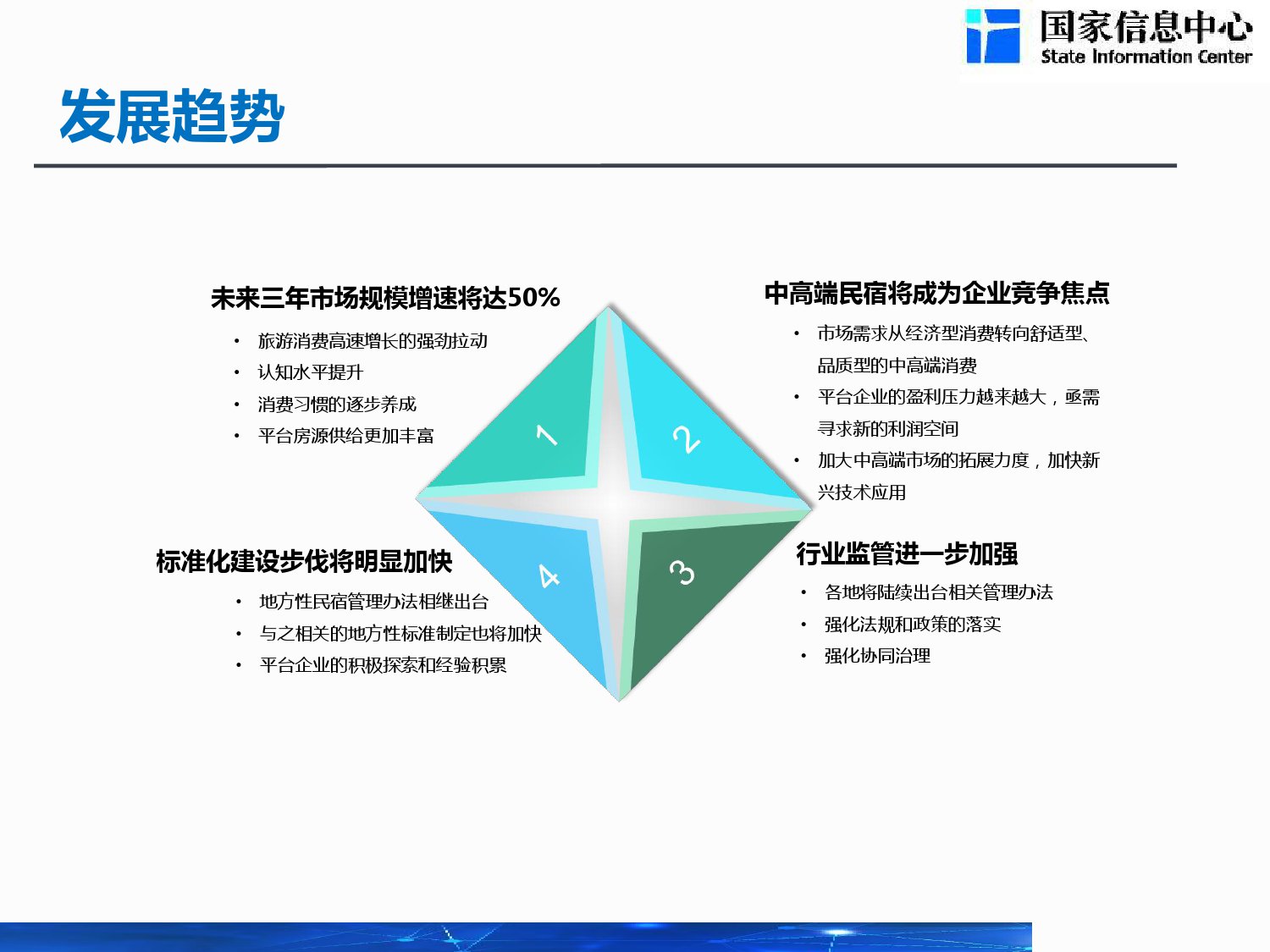 报告预测,未来三年,我国共享住宿市场规模将继续保持50%左右的增长速度。随着消费水平和中高端生活服务需求的扩大,人们对共享住宿的需求也将从早期阶段的经济型消费转向舒适型、品质型的中高端消费,中高端民宿将成为平台企业竞争焦点,共享住宿领域的标准化建设步伐将明显加快。