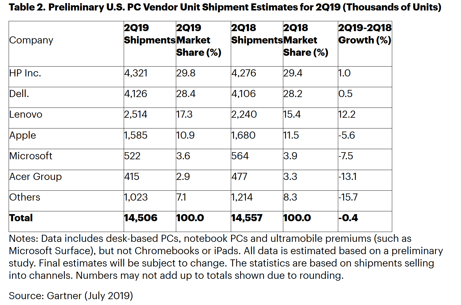 第二季度排名前三的供应商(联想、惠普和戴尔)的PC出货量占全球出货量的64.1%,而2018年第二季度出货量占全球的60.7%(参见表1)。