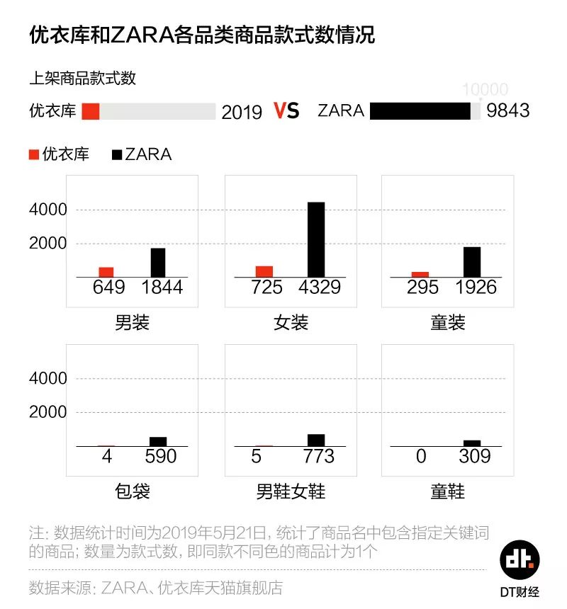 我们比较了2019年5月两个品牌在天猫旗舰店上架的商品,差异明显,优衣库商品数量只有ZARA的1/5。