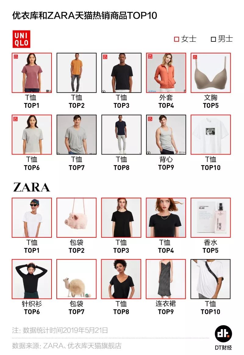DT君查看了两个品牌天猫旗舰店5月的热销商品,不管是ZARA还是优衣库,最畅销的款式都是基本款。