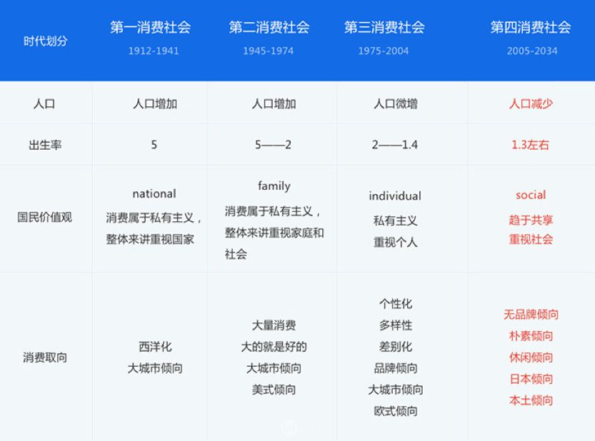 (图片说明:日本消费社会的四个阶段,图片来源:大牙-《第四消费时代,影响着我们的产品设计》)