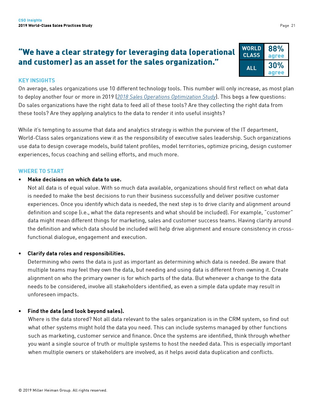 在被视为世界级的企业受访者中有88%表示他们有明确的战略,将运营和客户数据作为销售组织的资产加以利用,但只有30%的整体受访者可以这么说。