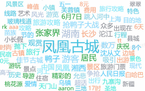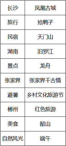 综合2019年6月1日至6月30日“湖南旅游”相关信息中关键词的词频、热度权重、关联强度因素,“长沙”、“旅行”、“民宿”、“湖南”、“景点”、“张家界”等词语成为网友热议词汇。同时,“凤凰古城”、“抢鸭子”、“天门山”、“汨罗江”、“龙舟”等词语可以看出本月网友关注湖南旅游的侧重点。
