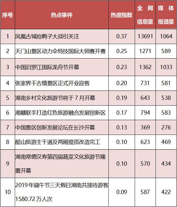 在本月湖南省旅游热点事件当中,“凤凰古城抢鸭子大战引关注”一事的热度最高,热度指数为0.37,全网信息量为1.4万条,媒体信息量为1064条。