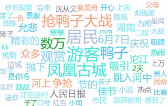 进一步对本月“凤凰古城”的关键词云进行分析,“鸭子”、“观赏”、“6月7日”、“抢鸭子大战”等词成为核心传播词,可见6月7日的“抢鸭子大战”是本月“凤凰古城”热度较高的原因。