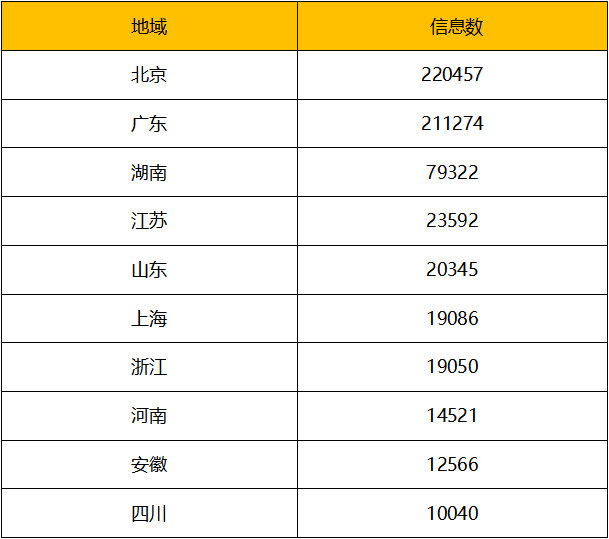 从地域分析看,北京和广东的网友对湖南旅游的相关信息较为关注,分别产生22.0万和21.1万条相关信息。湖南省网友对本省的旅游信息关注度排名第三,产生了7.9万条信息。同时,江苏、山东、上海、浙江等地的网友对湖南省旅游及其相关信息的关注度也比较高。