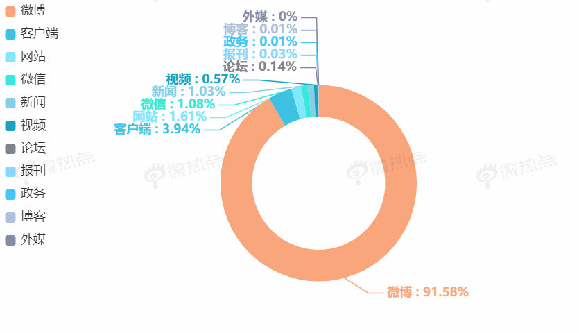 该事件在全网共产生信息量1.4万条,从其媒体来源占比可以看出,来源于微博的信息量占比高达91.58%,微博成为最主要的传播平台。