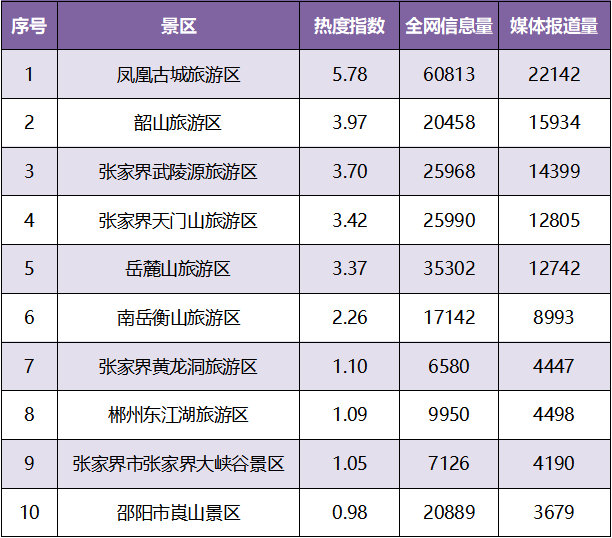 本月湖南旅游景区热度指数排行榜如下。“凤凰古城旅游区”的本月热度指数高达5.78,位于榜单首位。“韶山旅游区”、“张家界武陵源旅游区”分列二三位,热度指数分别为3.97和3.70。