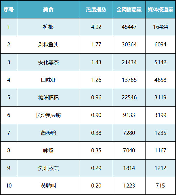 在6月湖南美食热度榜中,“槟榔”以4.92的热度位列湖南美食热度榜首,全网信息量更是高达4.5万条,热度指数、全网信息量和媒体报道量,均高于榜单中的其他湖南美食。