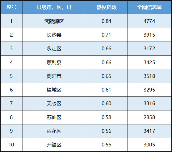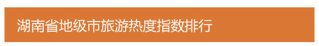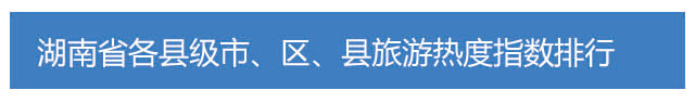 通过统计,“武陵源区”、“长沙县”、“永定区”为本月湖南区县旅游热度指数排行榜前三名。“武陵源区”位居首位,热度指数0.84;“长沙县”屈居第三,热度指数0.71;“永定区”位居第三,热度指数为0.66。