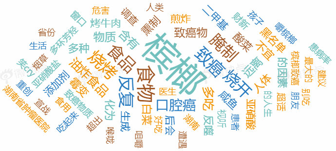 进一步对“槟榔”本月的关键词云进行分析,“槟榔”、“致癌”、“口腔癌”、“亚硝酸盐”等词汇体现出“槟榔”的致癌性是其热度常年居高的原因。