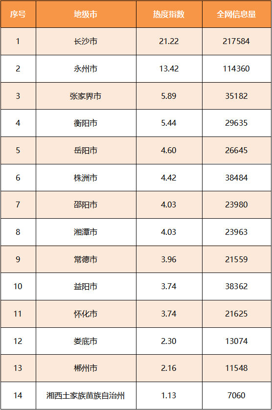在本月的湖南省地级市旅游热度指数排行榜中,省会“长沙”高居首位,热度指数为21.22,远超其他地级市的热度指数,全网信息量高达21.8万条,较5月有所下降。“中国景区创新发展论坛在长沙开幕”、“长沙端午接待游客305.11万人次”、“湘泰文化旅游交流合作座谈会在长沙举行”为本月长沙主要旅游事件。