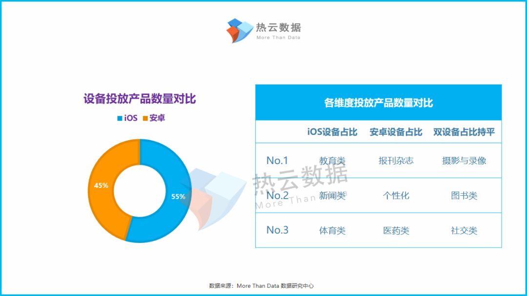 作为iOS的“主场”,美国应用App市场在iOS投放的App数量高于安卓,达到55%。其中,iOS设备上投放的教育类、新闻类以及体育类App数量明显高于安卓设备。反观安卓设备上,报刊杂志、个性化以及医药类App则更具有优势。另,摄影与录像、图书类以及社交类App在两设备投放的产品数量是所有应用App类型中最为均衡的三种类型。值得一提的是,图书类App在美国的投放行为与国内阅读类App的情况有所不同:国内阅读类App基于其广泛的用户规模与变现模式,主要以选择安卓设备投放为主。