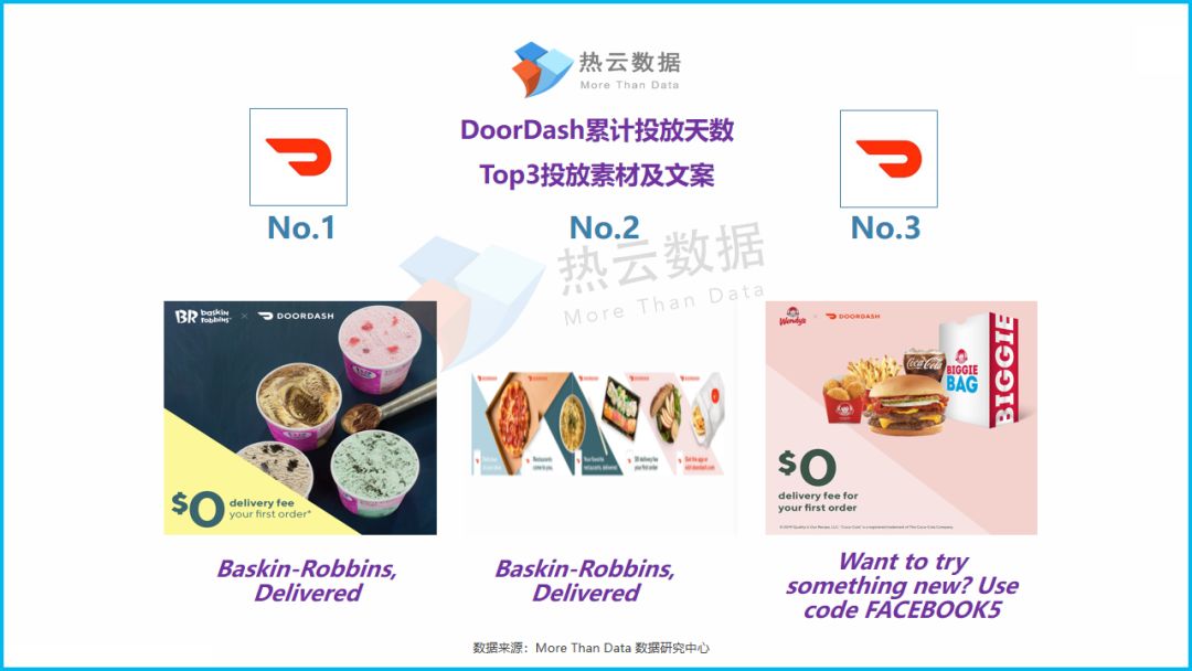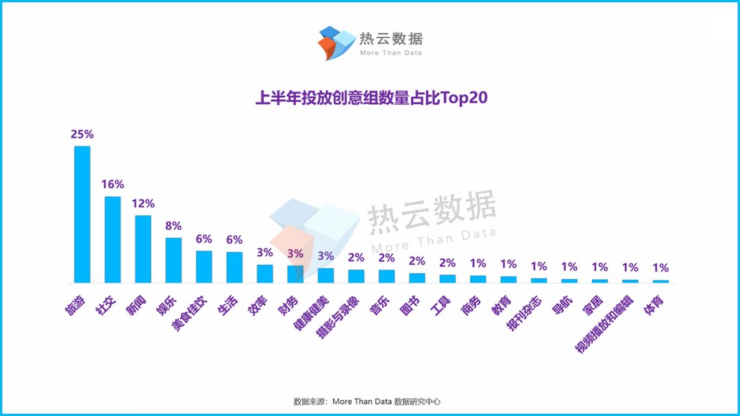 在投放创意组数量占比维度上,旅游、社交以及新闻类App的素材丰富程度最高,排在美国上半年投放创意组数量的前三位。按各月投放Top排名来看,上述三个类型分别平均占据各月的榜首。其中,美食佳饮类App中排名前列的几乎被“外卖”占据且在最近的5-6月涨势明显。
