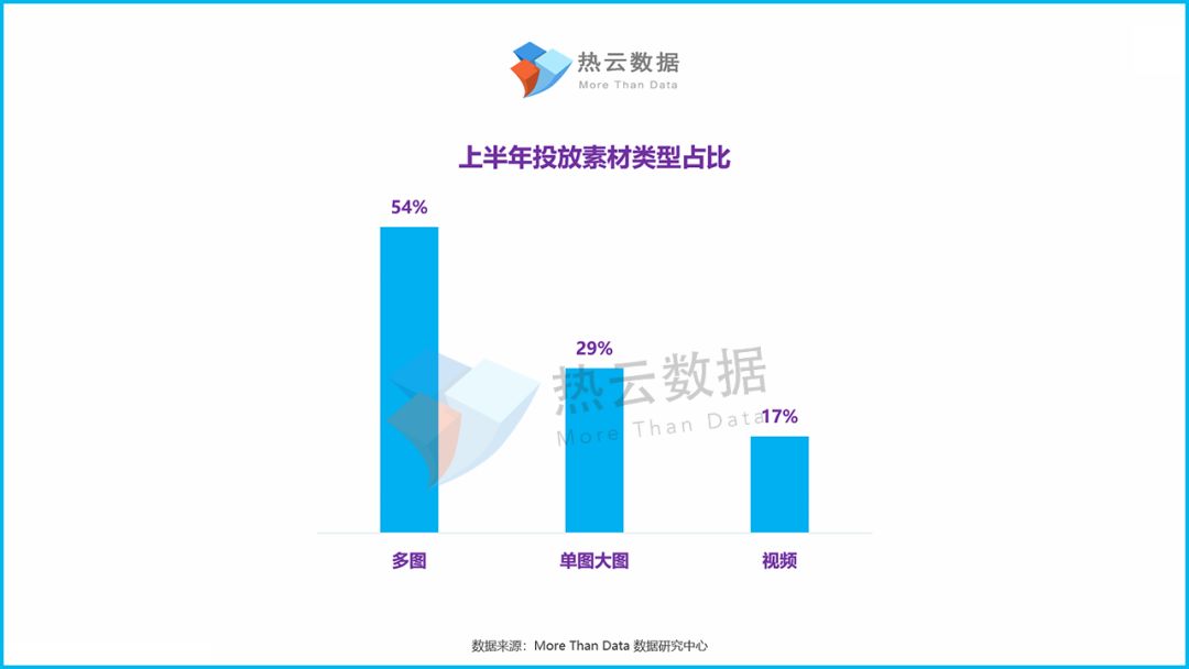 上半年日本应用App投放素材类型仍以多图形式为主,与美国市场的分布趋势基本相同。相比之下,日本应用App投放市场的多图形式素材占比接近八成,高于美国市场。