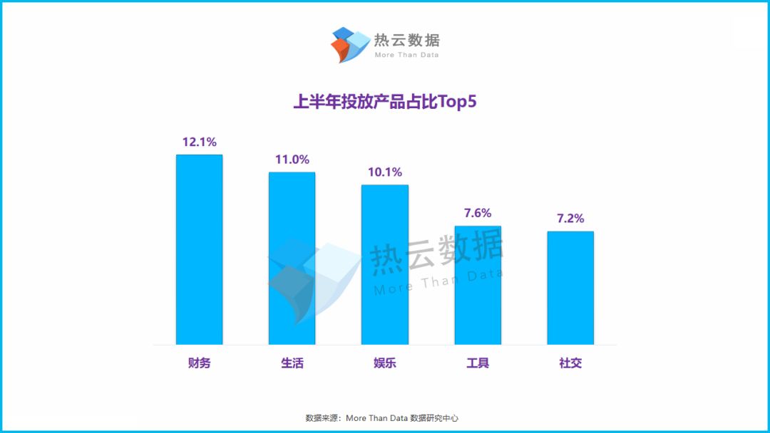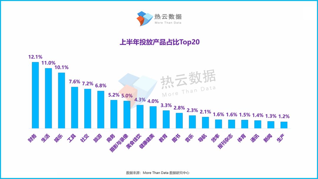 日本与美国虽同为成熟的App市场,但从投放行为偏好上仍具有明显的差异。2019上半年日本应用App市场投放产品数量最多的类型为财务类App,其次为生活类App。此外,与美国市场相比,社交类App的投放产品占比排在第5,排名高于美国市场。